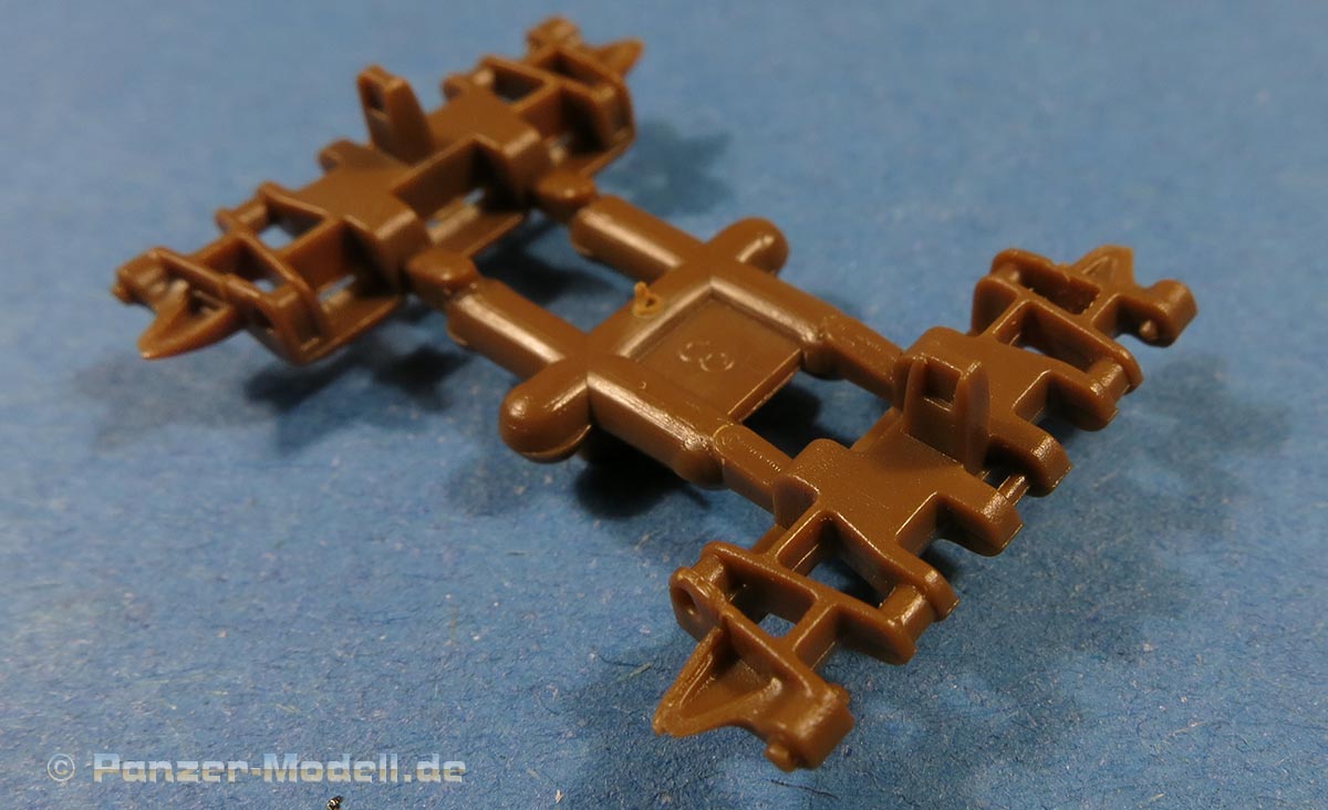 Die Ketten liegen als Einzelglieder vor, die im Zweierpack an einem Anspritzling angegeossen sind. Die Ketten sollen beweglich gebaut werden können und lassen sich einfach zusammenklicken - also nicht mehr das aufwändige Verbundsystem wie in der ersten Produktionsserie der Conquerorbausätze. Dies ist ein großer Serviceschritt. Ebenfalls höchst erfreulich, dass die Ketten sauber und detailliert gespritzt sind und frei von Auswerferstellen sind.