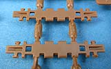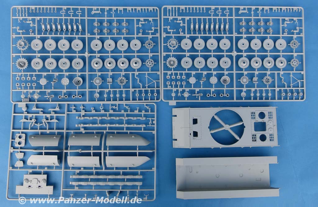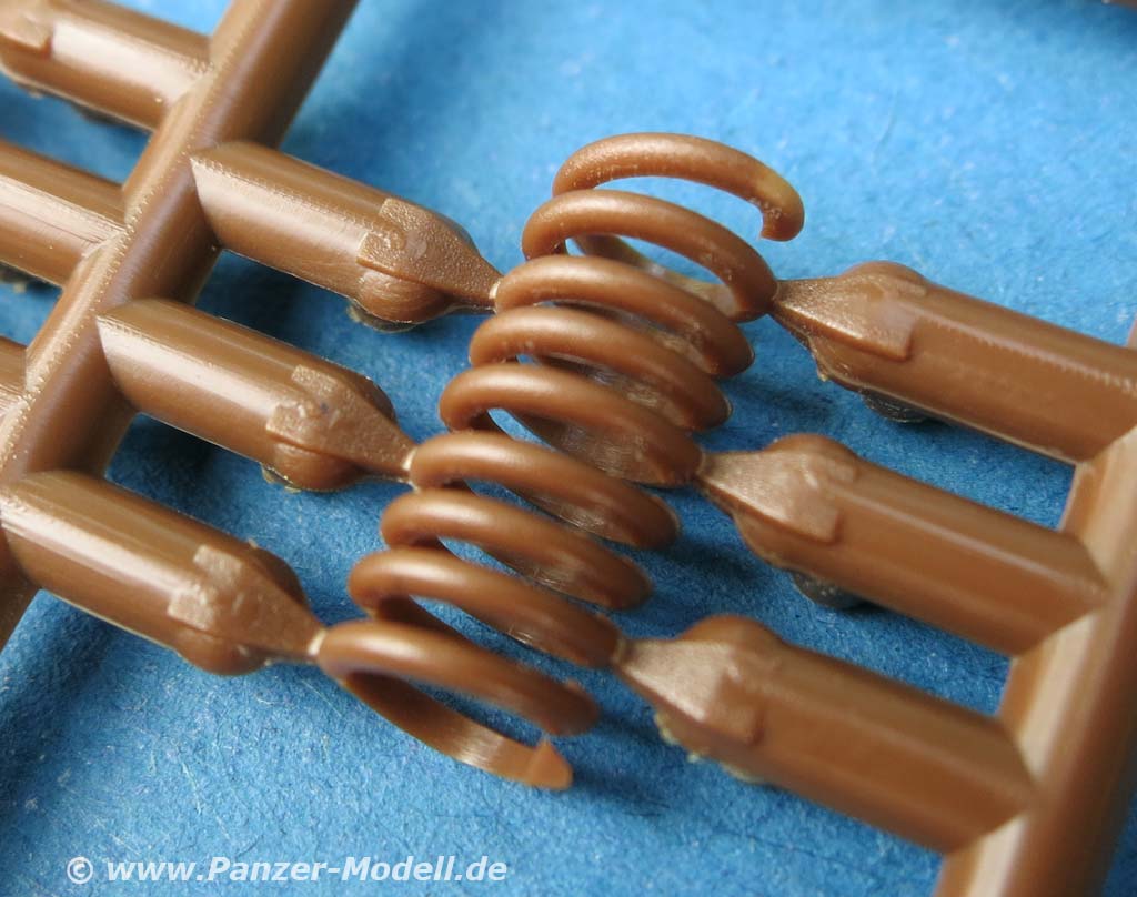 Die Unterwanne ist einteilig und macht einen guten Eindruck. Das Laufwerk baut sich aus angenehm wenigen Teilen zusammen - der Knüller ist allerdings die Beigabe von Spiralfedern aus Plastikspritzguss, die das Laufwerk beweglich machen, denn die Schwinarme werden ebenfalls nur eingesteckt und von innen beweglich gesichert. Zwar wird es etwas Arbeit machen, die Spiralfedern sauber aus dem Spritzling zu trennen und zu versäubern - aber eine bewegliche Federung damit für einen E-100 hat schon etwas!