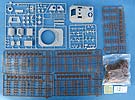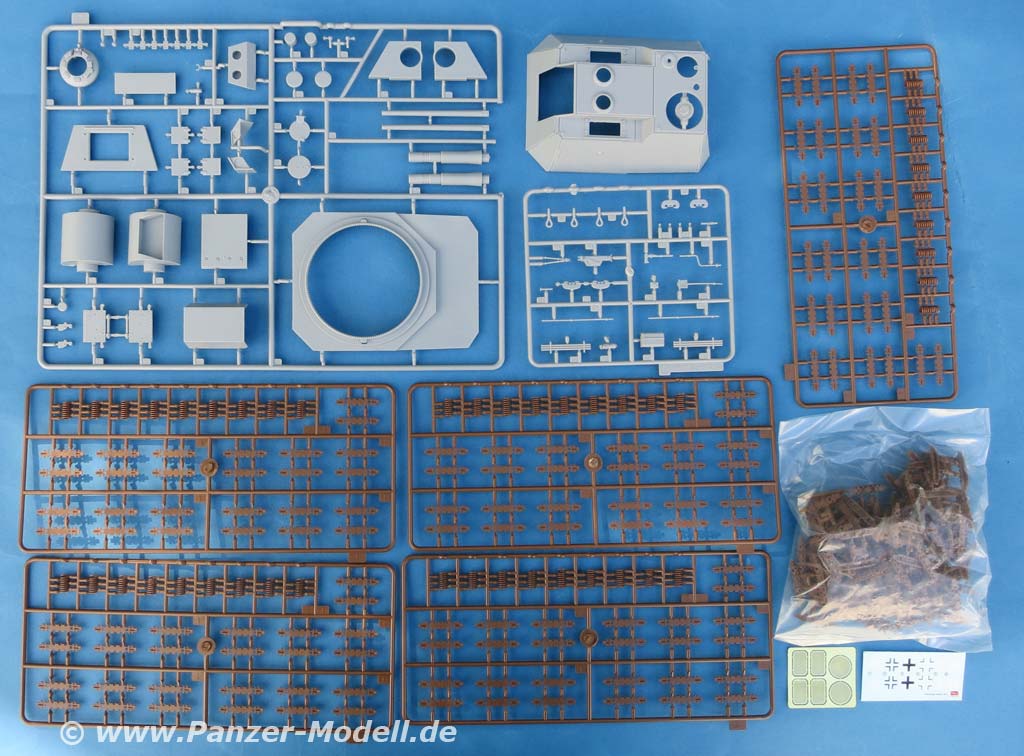 Im Karton finden wir 5 graue, 5 rotbraune Spritzlinge, eine Tüte mit Einzelkettengliedern, die Ober- und Unterwanne, das Turmoberteil, eine Platine PE Teile und ein Decalbogen.