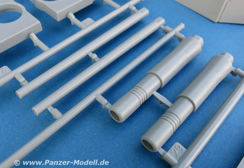Die beiden 8,8cm Flakrohre werden höhenbeweglich im Turm gelagert. Das beste hier widerum ist, dass die Rohre als Vollrohre mit schöber Darstellung in Plastik im Bausatz vorhanden sind. Dabei wird jedes Rohr aus zwei Teilen zusammengesteckt und nicht wie bei anderen Herstellen aus zwei Halbteilen, die eine unschöne Naht längs des Rohres ergeben - also alles bestens hier.