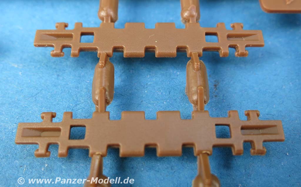 EIn weiterer Clou des Bausatzes ist sicher die Kette - schrfe, saubere Details, keinerlei Auswerferstellen, nur zwei Angüsse pro Hauptkettenglie, vier Angüsse pro Zwischenglied UND die Kettenteile lassen sich einfach ineinanderklicken und halten die Kette recht stabil zusammen. (Ich wäre am Ende trotzdem vorsichtig mit washing Lösungen auf der Kette, die ggf. die kleinen Plastikstifte porös machen)
