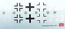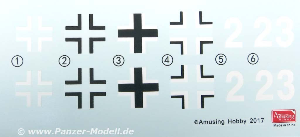 Es liegt ein Decalbogen mit 4 verschiedenen Sorten Balkenkreuzen und zwei weißen Zahlen 2 und 23 bei
