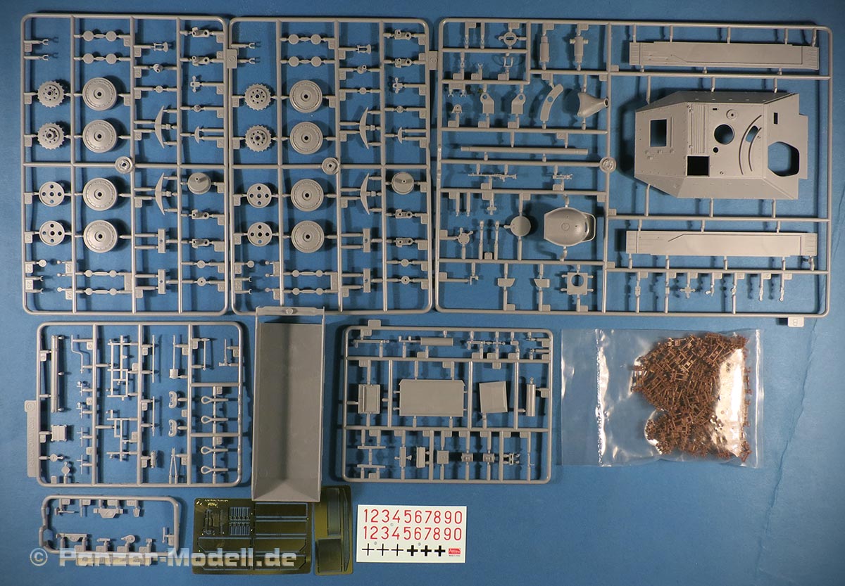 Im Karton finden wir 6 graue Spritzlinge, ein Beutel mit Kettengliedern in braunem Plastik, die Unterwanne, zwei PE Platinen und ein Decalbogen.
