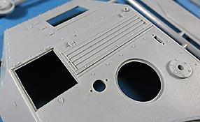 Die Oberwanne ist einteilig mit der entsprechend korrekten Gestaltung des 38 D mit dem geänderten Aufbau und Motordeck für den angedachten Dieselmotor. Die Detaillierung ist dabei sehr schön anzusehen, insbesondere auf dem Aufbaudach und Motordeck mit den feinen Nietenreihen, Scharnieren und Lüfterlamellen. Letztere werden dann von einem feinen Gitter aus der PE Platine abgedeckt. Auch um die Lufteinlasshutze wird ein passendes PE Gitter angebracht.