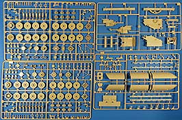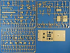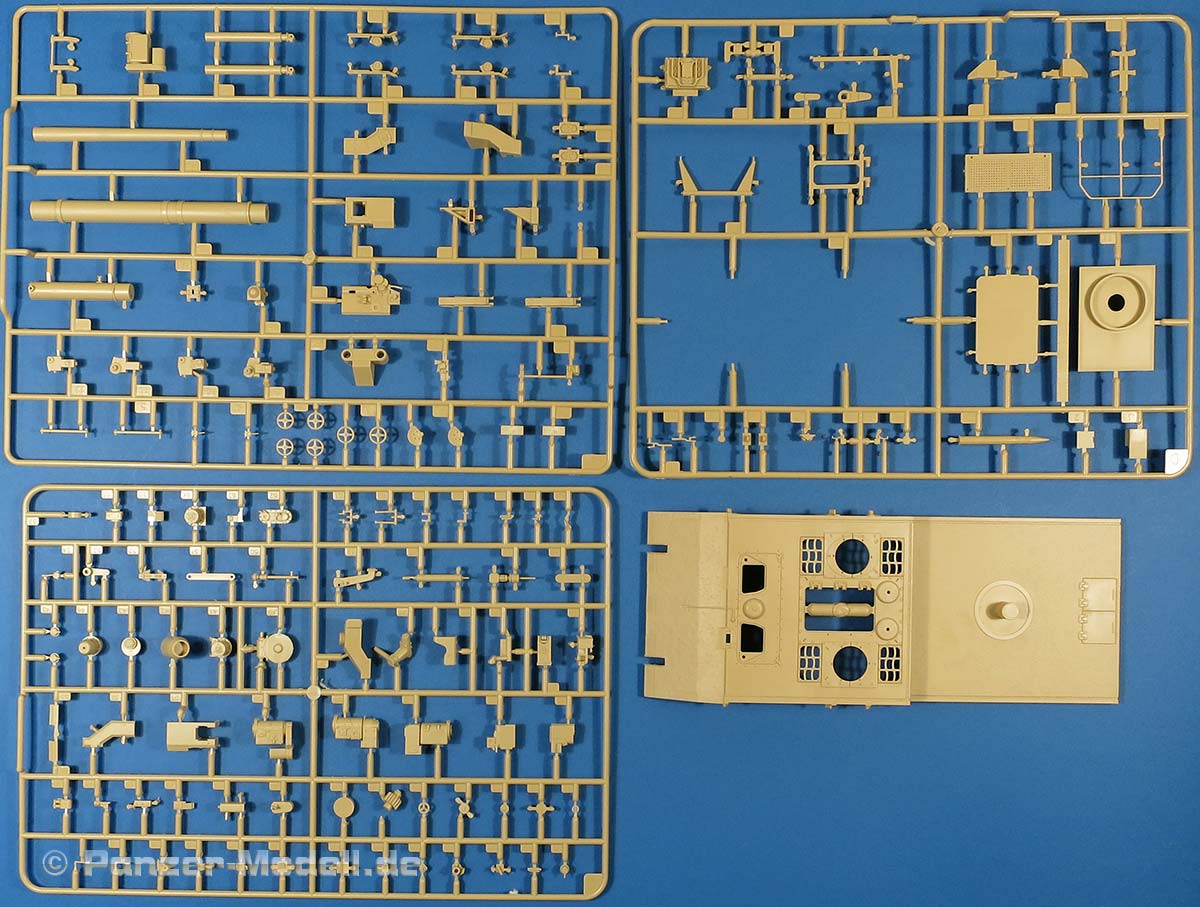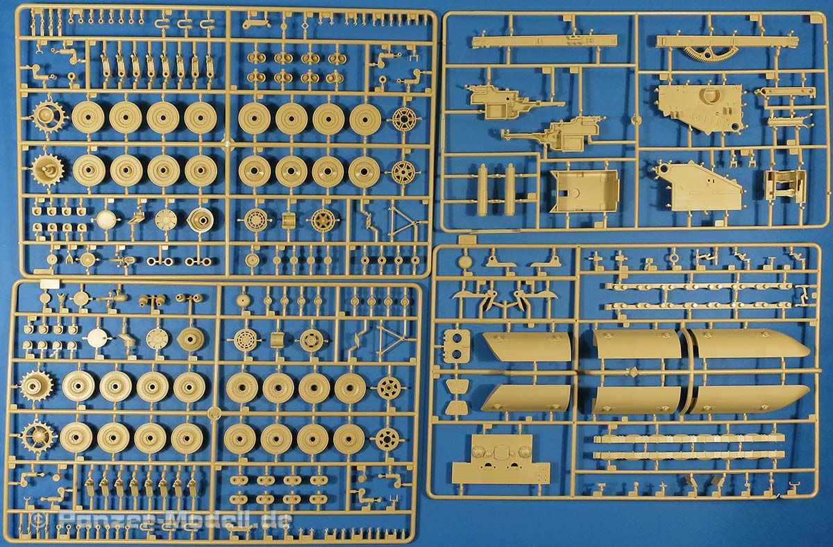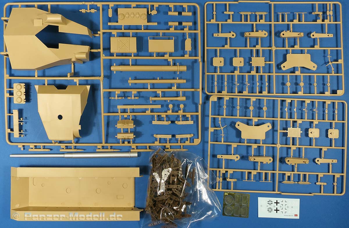 Im recht großen und randvoll gefüllten Karton finden wir 13 beige, 5 rotbraune Spritzlinge, eine Tüte Kettenglieder, ein Alu-Rohr (nur in der Erstauflage), die Unterwanne, die Oberwanne, eine kleine PE Platine und ein Decalbogen.