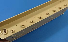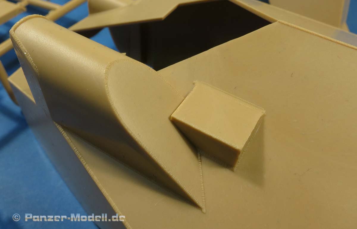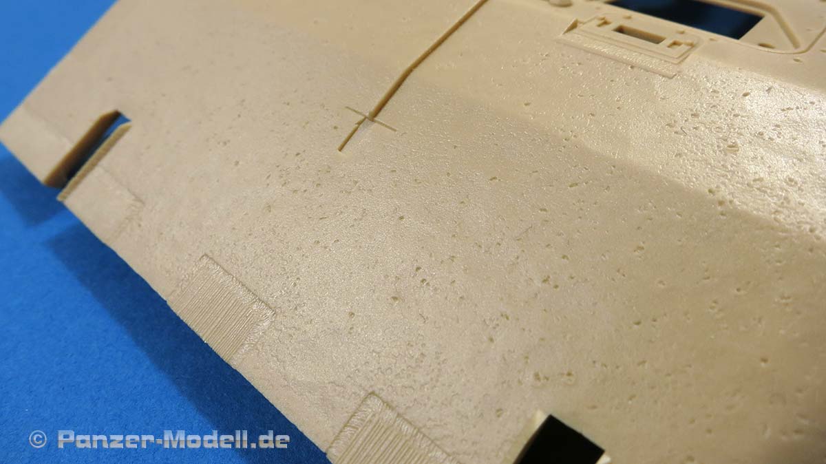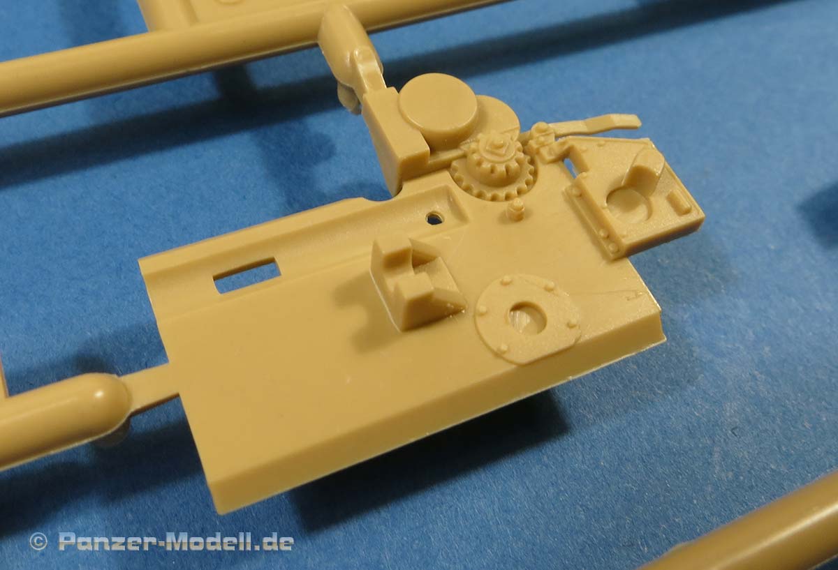 Dei Oberwanne ist komplett neu mit dem Motordeck mittig und der abgesetzten Plattform am Heck. Die Wannenseiten weisen im vorderen Bereich noch die Haltepunkte für die Seitenschürzen auf und die Schürzen liegen auch dem Bausatz bei, werden hier aber nicht benötigt.