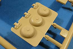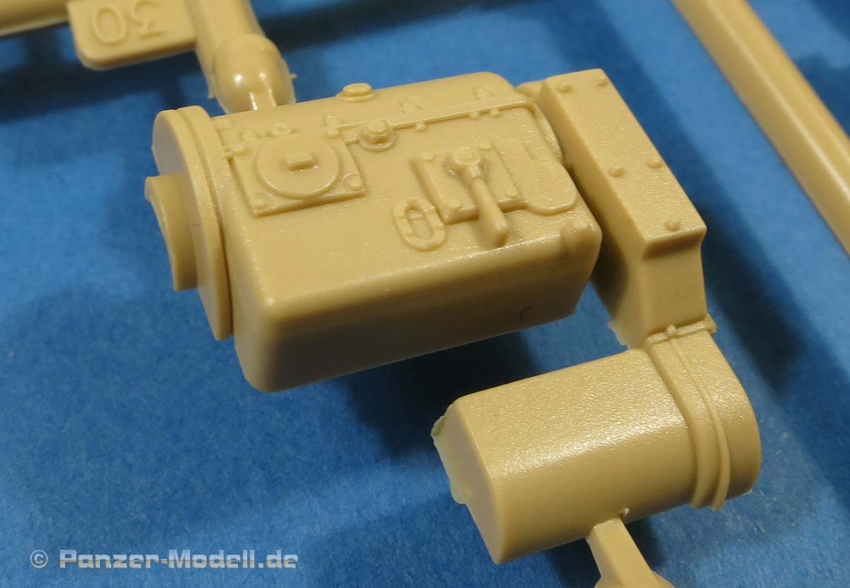 Dieses Mal wurde auch nicht versäumt an die Auspuffanlage des Panzers zu denken, was bei diesen Mittelmotorwannen ja immer etwas kniffelig ist - hier liegen also 2 runde Auspufftöpfe aus zwei Halbteilen bei, die am hinteren Ende des Motordecks angebaut werden.