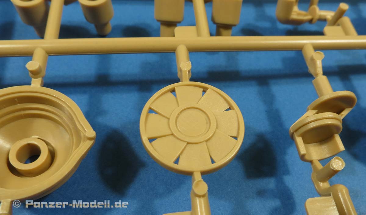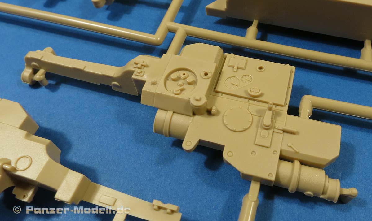 Das Geschütz besteht in großen Teilen aus bereits bekannten Teilen aus der 128mm Einzelflak mit diversen Änderungen. Die Details sehen seht gut und fein aus und sind sauber gespritzt. Nieten, Schraubenköpfe, Klappen, Zahnräder, Anzeigeinstrumente, alles sehr schön und ordentlich.