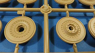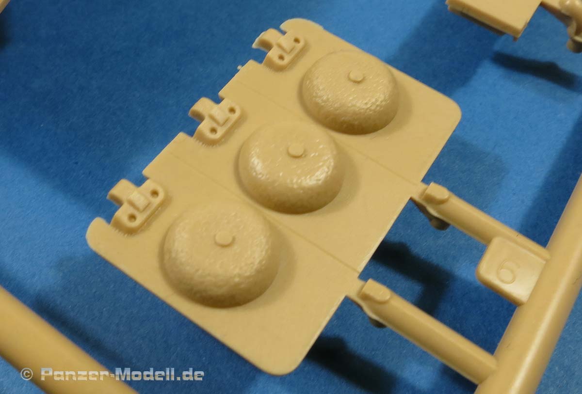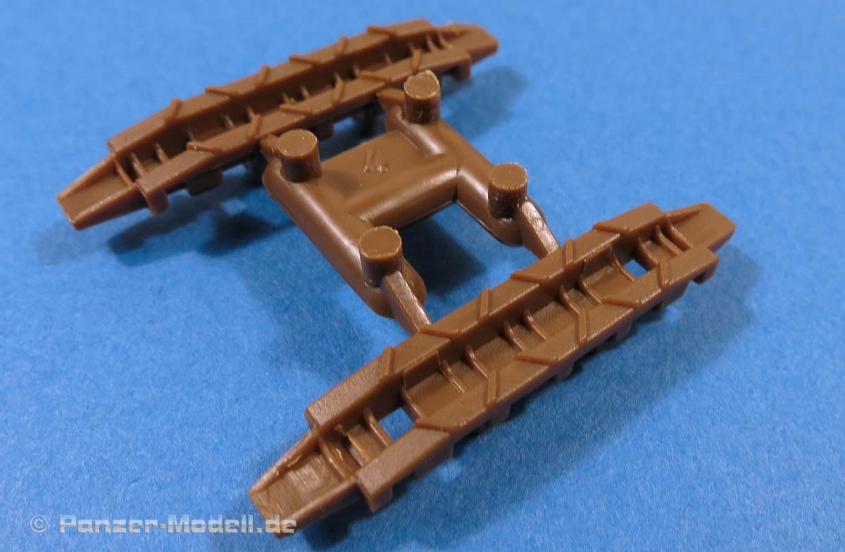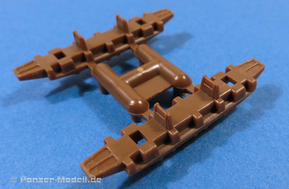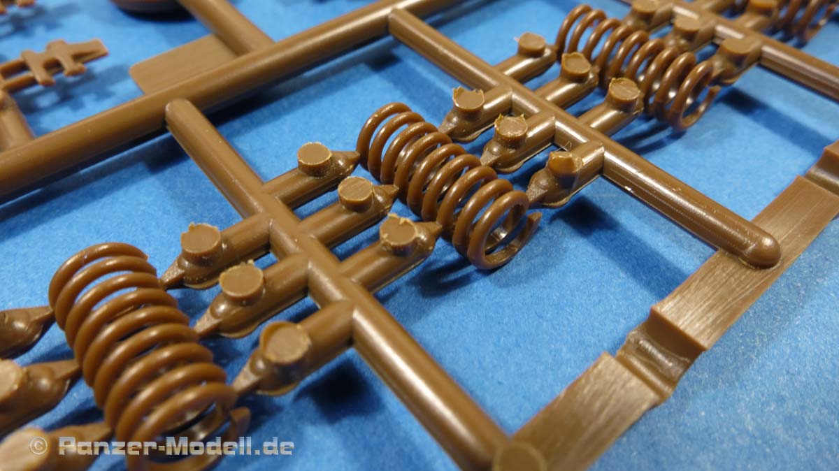 Die Unterwanne, die man bereits von den vorigen E-100 Bausätzen kennt, ist einteilig und macht einen guten Eindruck. Das Laufwerk baut sich aus angenehm wenigen Teilen zusammen - der Knüller ist allerdings die Beigabe von Spiralfedern aus Plastikspritzguss, die das Laufwerk beweglich machen, denn die Schwinarme werden ebenfalls nur eingesteckt und von innen beweglich gesichert. Zwar wird es etwas Arbeit machen, die Spiralfedern sauber aus dem Spritzling zu trennen und zu versäubern - aber eine bewegliche Federung damit für einen E-100 hat schon was!