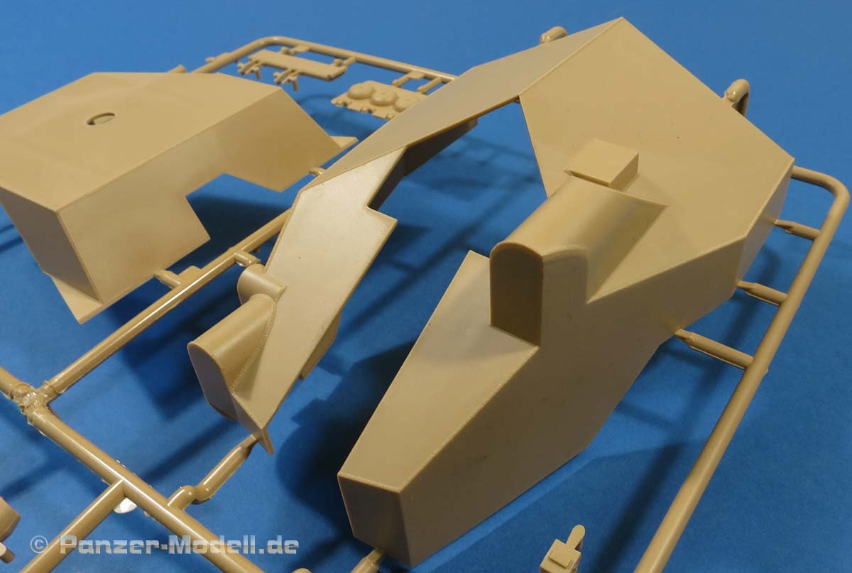 Zum Schutz des Geschützes und der Besatzung liegt noch eine einteilige Panzerhaube bei die nach hinten offen ist. Diese ist recht beeindruckend groß und weist schön gestaltete, feine Schweißnähte auf.