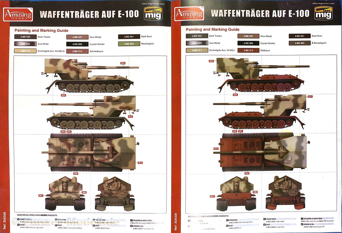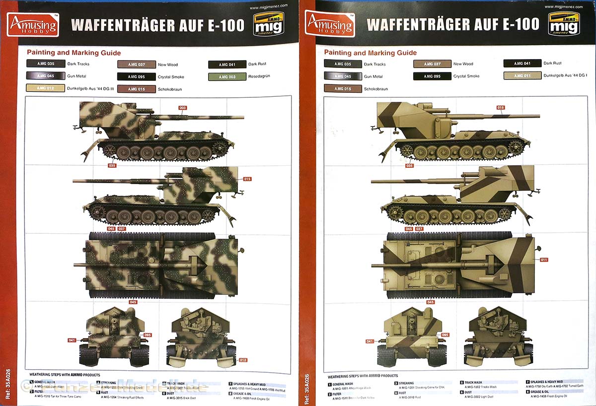 Ein einzeln beiliegender 4-seitiger, farbig gedruckter A4 Bogen zeigt in 5-Seiten Zeichungen vier Bemalungsvorschläge. Die Farbangaben sind für Ammo of Mig Farben.