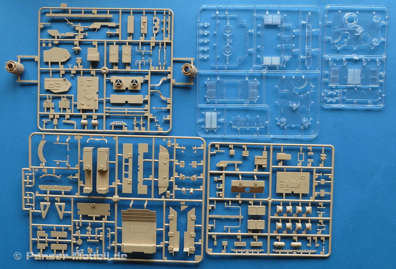 Hier finden wir 14 sandgelbe Spritzlinge, 2 transparente Spritzlinge, 12 Stränge an rotbraunen Einzelkettengliedern, Unterwanne, Kasemattaufbau, eine PE Platine, Kupferseil, Metalldrahtfedern, ein Bogen Zimmeritdecals und ein Decalbogen.