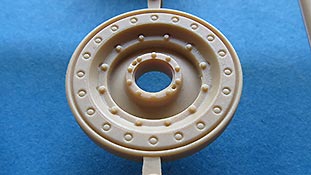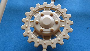Die Laufrollen, wie auch Treib und Leitrad machen einen guten Eindruck mit der Vielzahl an Schrauben und Nieten und ihrer unverwechselbaren Formgebung - die beiden unterschiedlichen Laufrollen sollte man beim Anbau an das Laufwerk dann auch nicht verwechseln.