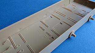 Über den Elektromotoren und dem hinteren Teil des Motorraums mit Lüftern für die Elektromotoren sitzt die Bodenplatte des Kampfraums. Diese deckt die darunterliegenden Details leider völlig ab. Die Darstellung des Riffelblechs der Bodenplatte ist optisch sehr gelungen und auch die eingearbeitete Bodenluke ist fein und scharf abgegrenzt.