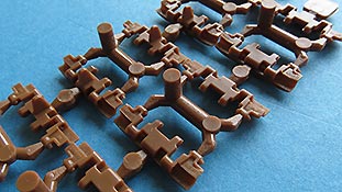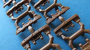 Die Kette ist die richtige mit den richtigen Details und Dimensionen für dieses Fahrzeug versehen. Dem Bausatz liegt eine bewegliche Einzelgliedkette aus Spritzguss bei, die erfreulicherweise mit nur 3 Angüssen pro Kettenglied daherkommt und einfach nur zusammengeklickt werden muss. Hier müssen wechselseitig ein Glied mit und eins ohne Führungszahn zusammengeklickt werden. Die Verbindung ist relativ stabil, dennoch würde es sich empfehlen sie am Ende zu verkleben.