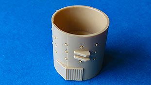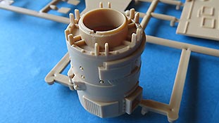 Im Kasemattaufbau, der einzeln beiliegt, sitzt neben den seitlichen Munitionshalterungen in denen man die schön gespritzten 8,8cm Granaten einsetzt, natürlich auch die Kanonenlagerung und der innere Teil der Kanone - dies alles relativ teilelastig und schön detailiert. Die Kanone bleibt seitlich und in der Höhe beweglich. Der Kasemattaufbau ist aussen und innen bereits schln detailliert. Aussen zeigt sich raue Gussstruktur und fein detaillierte Schweißnähte, die optisch wirklich ein Highlight sind.