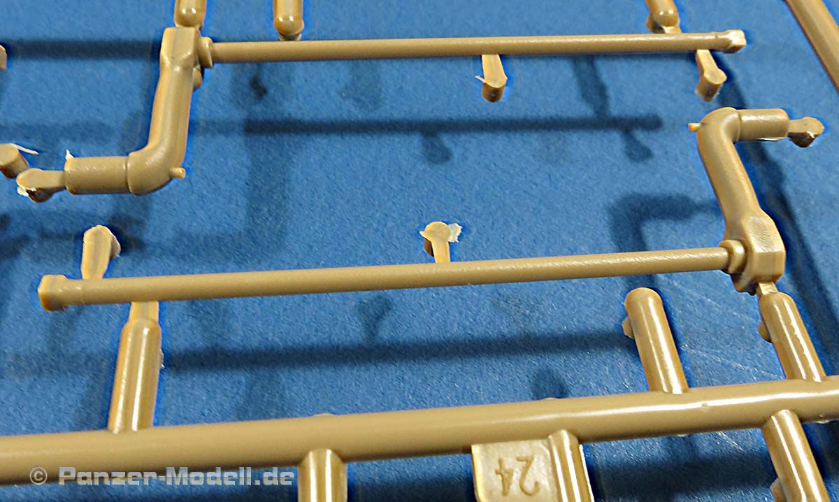 Die Schutzschilde an der Lafettenfront sind aus Spritzguss, welches naturgemäß etwas zu dick von der Stärke ist und als PE Teil sicher schöner gewesen wäre. Dennoch in der vorliegenden Form gut und vor allem mit den aufgeprägten Details sehr schön anzusehen.