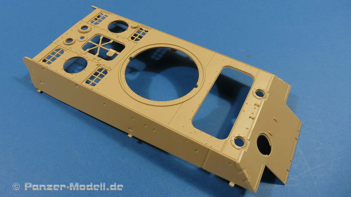 Die Oberwanne ist ebenfalls einteilig, wird aber mit diversen Anbauteilen vervollständigt. Auch hier alles sehr schön und sauber wiedergegeben. Das Motordeck ist sehr gut dargestellt. Für die Lüftergitter liegen schöne geätzte Metallgitter bei. Es liegen auch Optionsteile bei um dem Modell auch spätere mögliche Produktionsausführungen zu ermöglichen, wie z.B. den erhöhten linken Lüfter für die Kampfraumheizung.