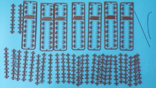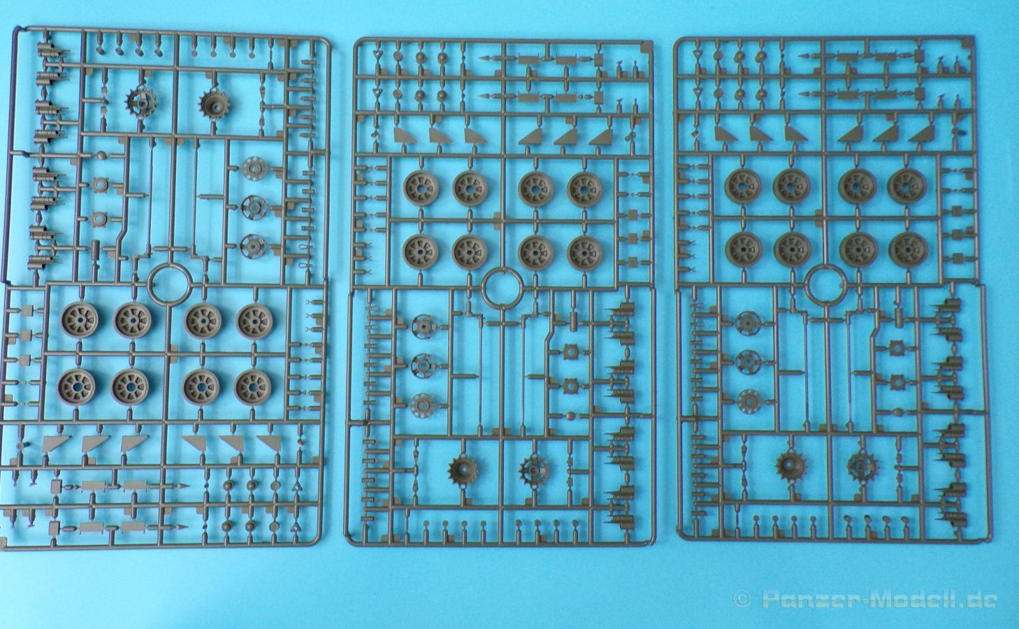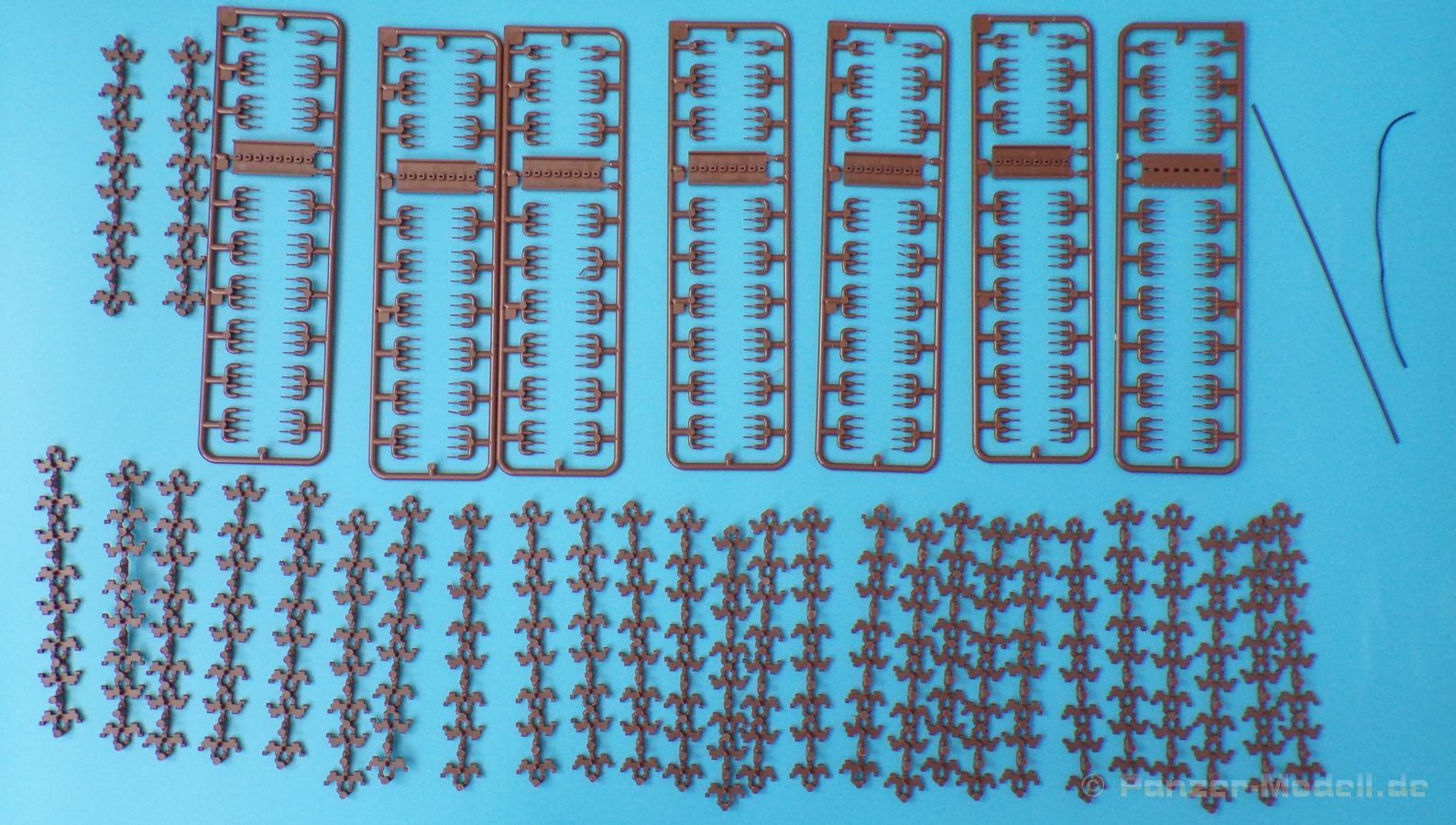 Die Kettenbolzen befinden sich an sieben eigenen Gussästen. Diese können zu Gruppen aus je zwei Bolzen bzw. vier Bolzen ausgeschnitten werden und mit Hilfe einer Montagehilfe, in welche die einzelnen Kettenglieder eingelegt werden, in die Bohrungen der einzelnen Glieder (ohne zu kleben) eingeführt werden. Dies ist sehr effektiv und die Kette bleibt beweglich. Ein recht einfaches System, jedoch ist sauberes Arbeiten hier Pflicht. Für jede Seite werden Fünfundneunzig Kettenglieder benötigt, die Kettenglieder befinden sich an Achtundzwanzig kleinen Strängen zu je 8 Gliedern, die einzeln ausgeschnitten und versäubert werden müssen.
