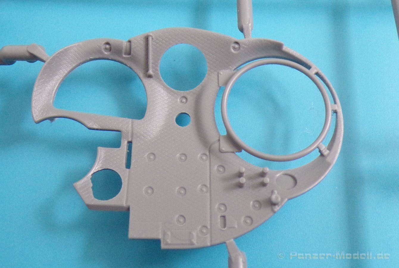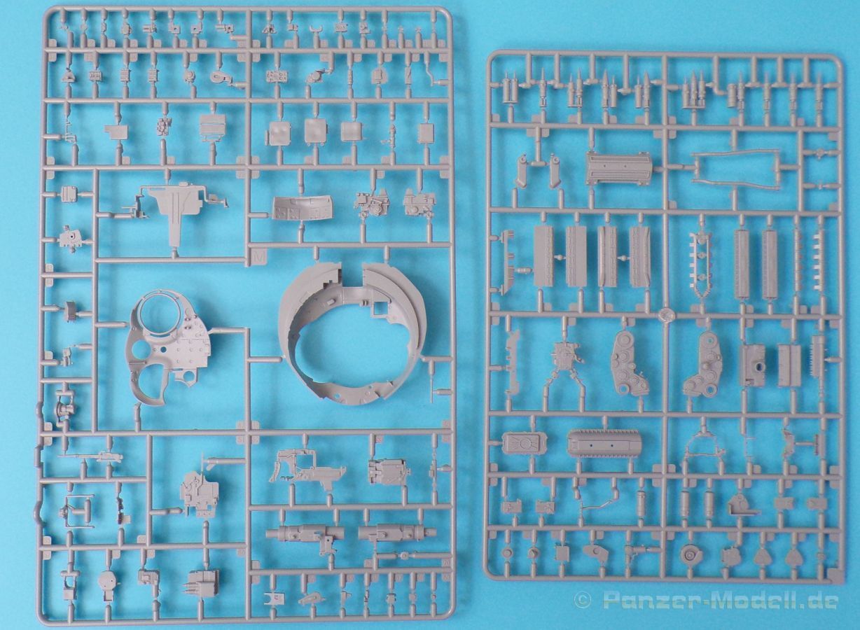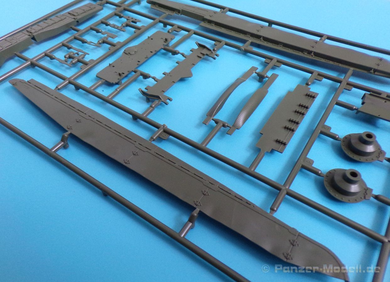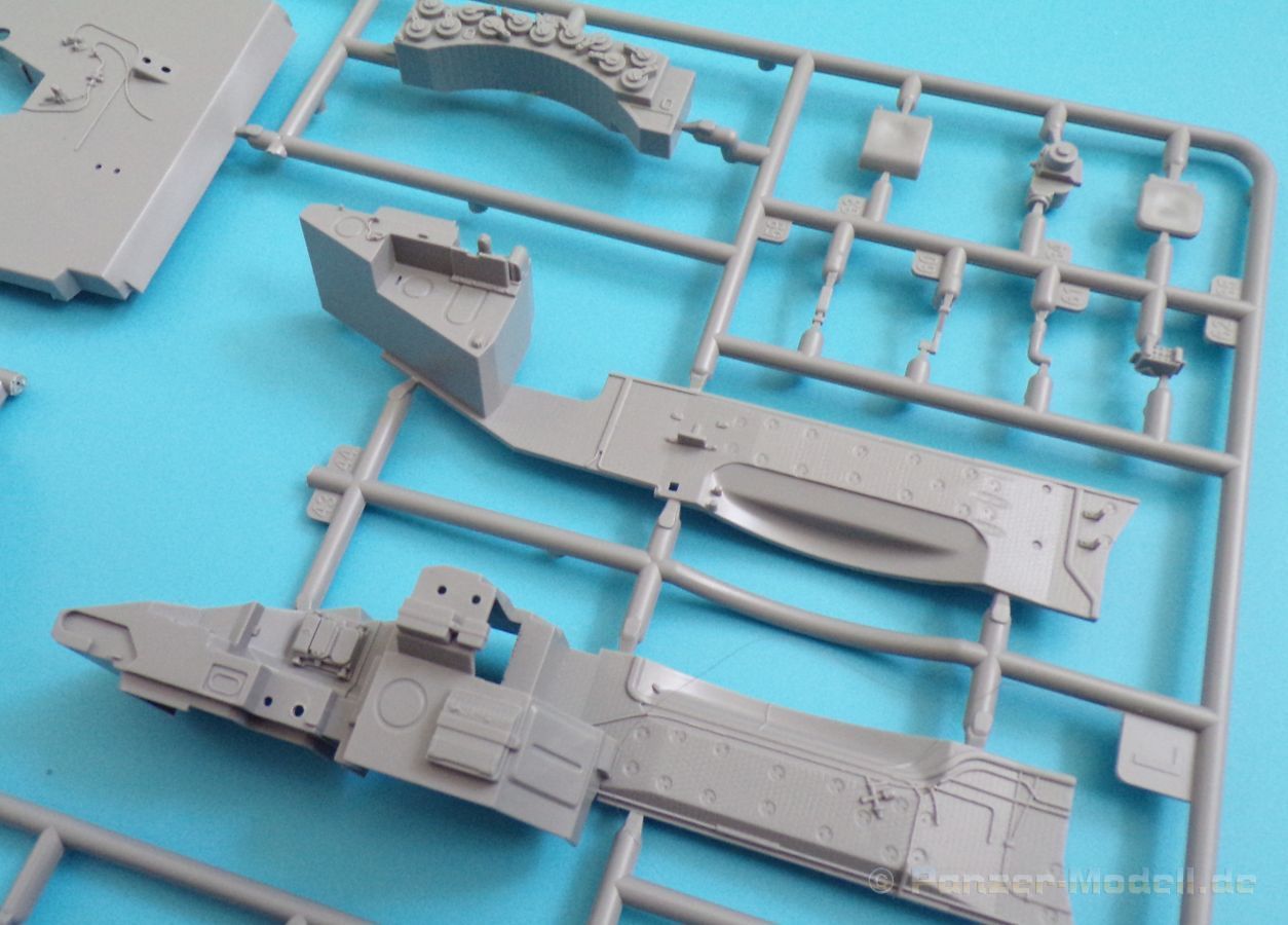 Die Detaillierung am gesamten Bausatz bewegt sich auf Top Niveau. Einige der Details werden auch durch die beiliegenden, nicht optionalen Fotoätzteile, dargestellt - zum Beispiel die Halter der Kettenbleche, sämtliche Lüftergitter und einige Details im Innenraum. An den Spritzlingen ist augenscheinlich weder Fischhaut zu finden noch sind auffällige Auswerfermarken an später sichtbaren Stellen zu erkennen.