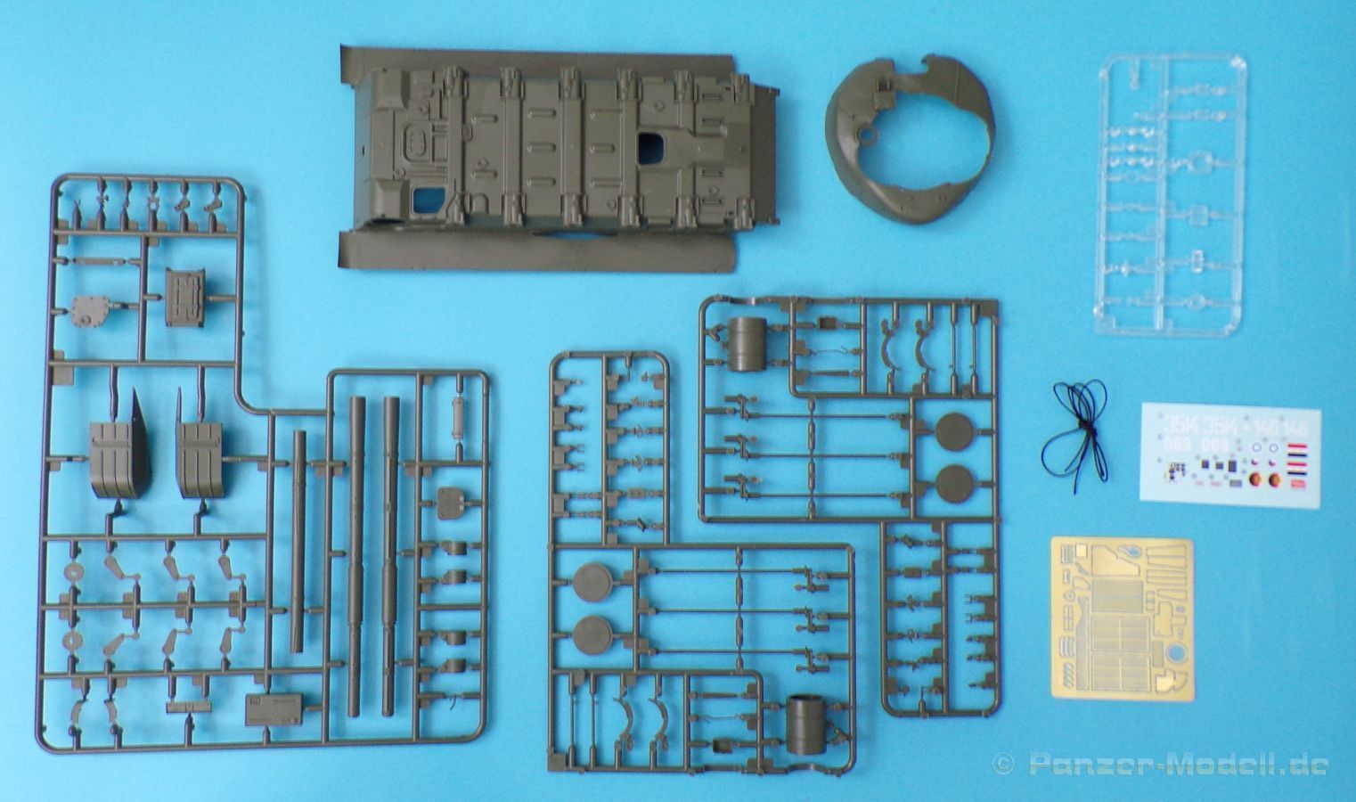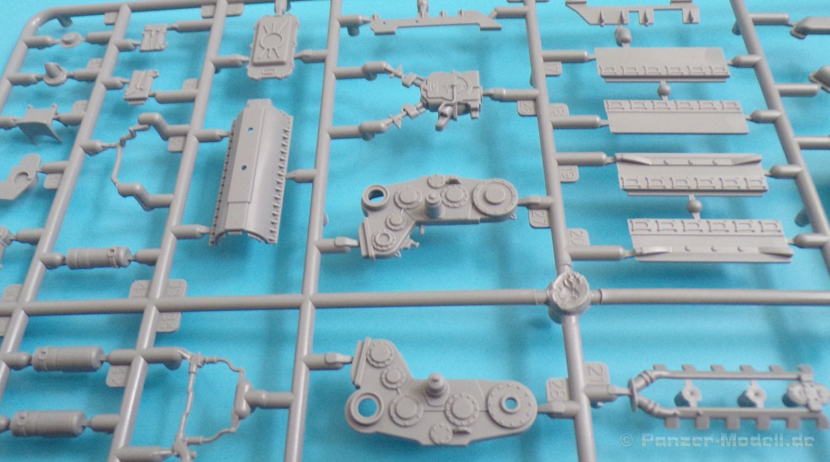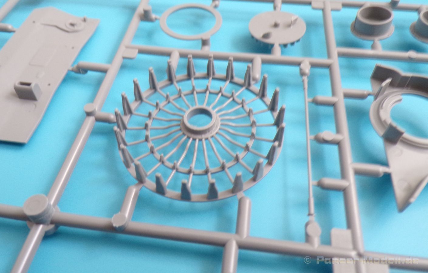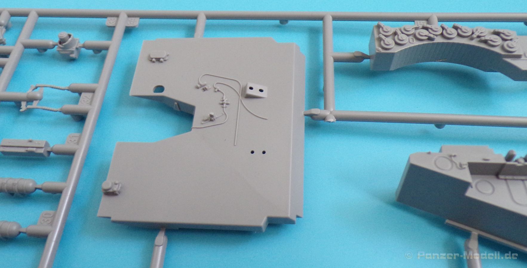 Die Detaillierung am gesamten Bausatz bewegt sich auf Top Niveau. Einige der Details werden auch durch die beiliegenden, nicht optionalen Fotoätzteile, dargestellt - zum Beispiel die Halter der Kettenbleche, sämtliche Lüftergitter und einige Details im Innenraum. An den Spritzlingen ist augenscheinlich weder Fischhaut zu finden noch sind auffällige Auswerfermarken an später sichtbaren Stellen zu erkennen.