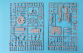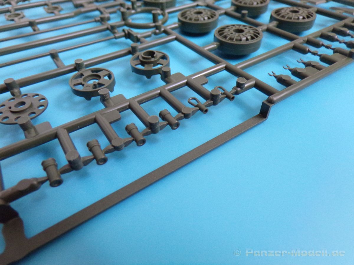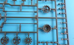 Beim Fahrwerk werden die Drehstäbe (mit den angegossenen Schwingarmen) in die hervorragend wiedergegeben Unterwanne geklebt, und bleiben beweglich. Dadurch kann das Modell auch an unebene Untergründe angepasst werden, und macht in jedem Diorama eine gute Figur. Auch die Triebräder, Leiträder Lauf- und Stützrollen sind sehr schön wiedergegeben und setzen sich erfreulicherweise aus nur wenigen Teilen zusammen, ohne hier an der Detaillierung zu sparen.