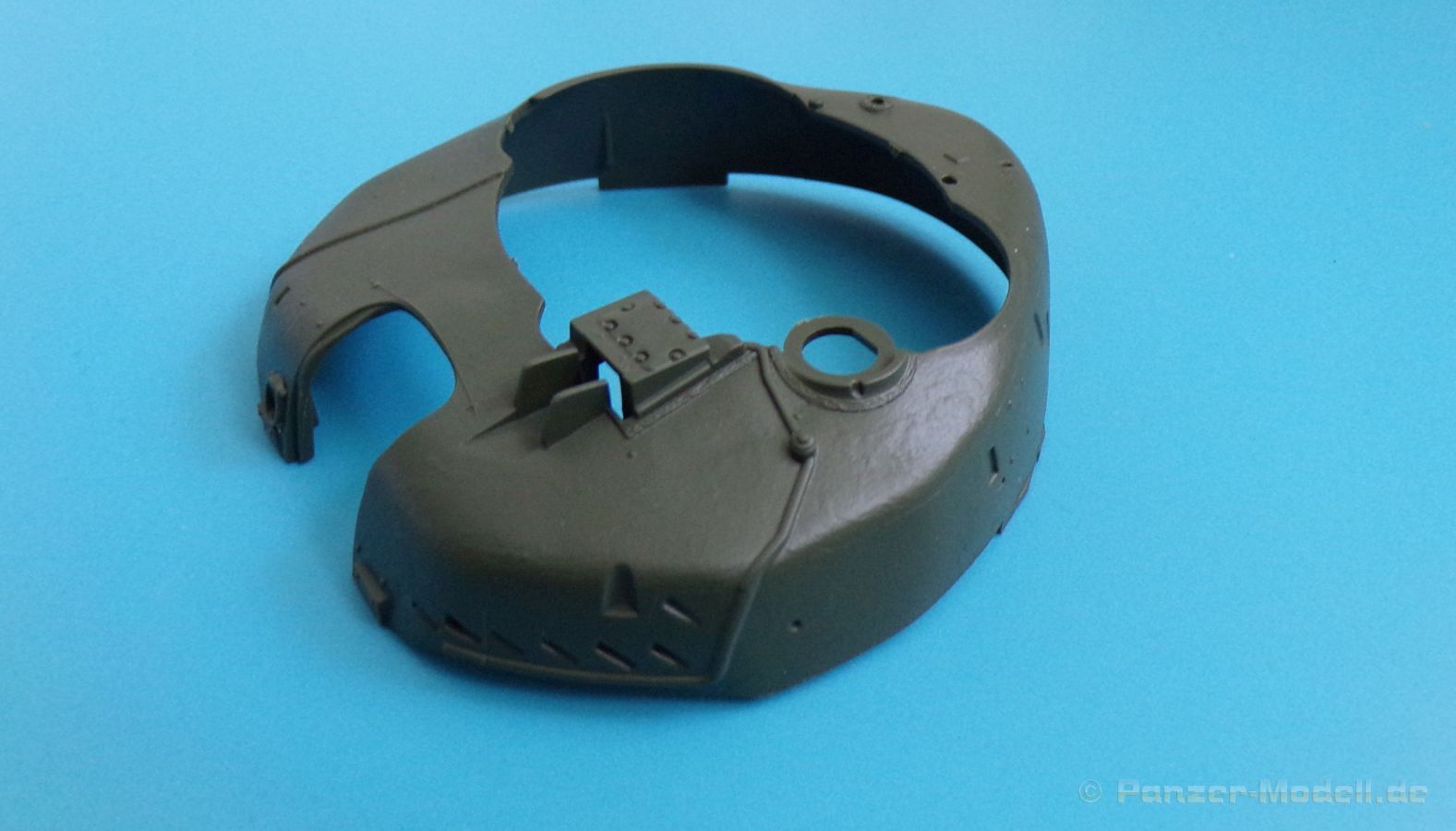 Die wasserdichte Plane an der Blende der Hauptbewaffnung ist im Spritzguss vorhanden und verfügt über eine realistische Faltenstruktur, auch sonst besticht der Turm auch von außen durch schöne Details, eine grandios dargestellte Gussstruktur des Turmes und feine Anbauteile.