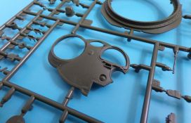 Bei der Bugplatte hat der Modellbauer die Wahl, ob er ein Fahrzeug mit Zusatzpanzerung (T-72M1) oder ohne (T-72M) bauen möchte, diese wird, wie beim Original, auf die Glacis-Platte aufgebracht. Hier befindet sich auch einer der wenigen Punkte, die mir nicht gefallen. Die Schutzkörbe der Frontscheinwerfer sollen mit schmalen Verstrebungen stumpf aufeinander gelebt werden. Das hätte man besser lösen können, zumal hier eine falsche Verklebung sofort auffällt.