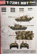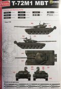 Der T-72 ist ein sowjetischer Kampfpanzer, welcher erstmals 1971 in die Produktion ging. Etwa 20.000 T-72-Panzer wurden gebaut. Die 1979 eingeführte T-72A-Version gilt als Kampfpanzer der zweiten Generation. Aus diesem wurde die Exportversion T-72M entwickelt mit älteren TPN-1-49-23-Nachtsichtgeräten. Ab 1980 lief diese Version u. a. der DDR, Polen und der ČSSR zu und wurde in beiden letztgenannten Staaten als T-72G auch in Lizenz gebaut. Ab 1982 wurde dann die Version T-72M1 mit einem modifizierten Turm mit Schottpanzerung, zusätzliche 16-mm-Panzerplatte auf dem Wannenbug und anderen Verbesserungen gebaut. Da sich im Bausatzkarton nur der späte T-72M1 Turm befindet, kann kein T-72G bzw. eine Übergangsversion zum T-72M1 gebaut werden.