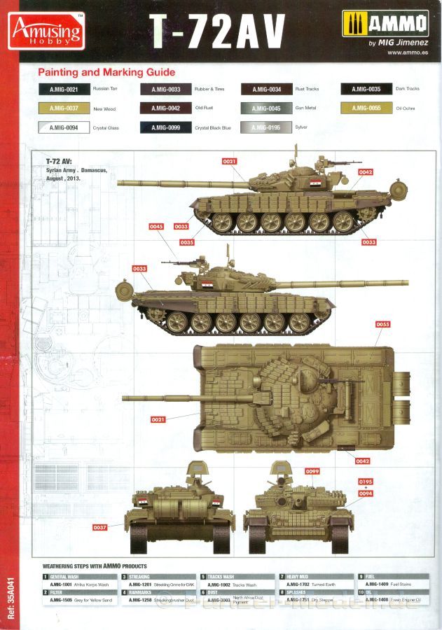 Die größtenteils schwarz-weiße Bauanleitung mit farbigen Elementen im A4-Format hat 36 Seiten. Zu Beginn finden wir nur Arbeits- und Sicherheitshinweise, sowie Symbolerklärungen. Die kurzgehaltenen Hinweise sind in Englisch, Japanisch und Chinesisch. Die folgenden beiden Seiten zeigen in großformatigen, farbigen Bildern die Bemalung der Inneneinrichtung mit Ammo by Mig-Farben. Zwei weitere Seiten beinhalten die Spritzling und Teileübersicht. Der Rest zeigt uns in 54 übersichtlichen, leicht verständlich Bauschritten den Weg zum fertigen Modell. Auf den letzten drei Seiten sehen wir die Anbringung der äußeren Decals und die Bemalung der drei Decalvarianten. Auch hier werden die Farbangaben zur Bemalung und Alterung für Ammo by Mig-Farben gemacht. In Deutschland ist der Bausatz seit November 2021 erhältlich und liegt knapp unter 70€. Bei dem Gebotenen ein angemessener Preis. Die sehr komplexe Inneneinrichtung und PE fordern Modellbauerfahrung! Das Ergebnis wird sich sicherlich sehen lassen können. Da es heutzutage genügend Vorbildfotos, z.B. grad aus Syrien, gibt, werden sicherlich bald einige Dioramen zu sehen sein.