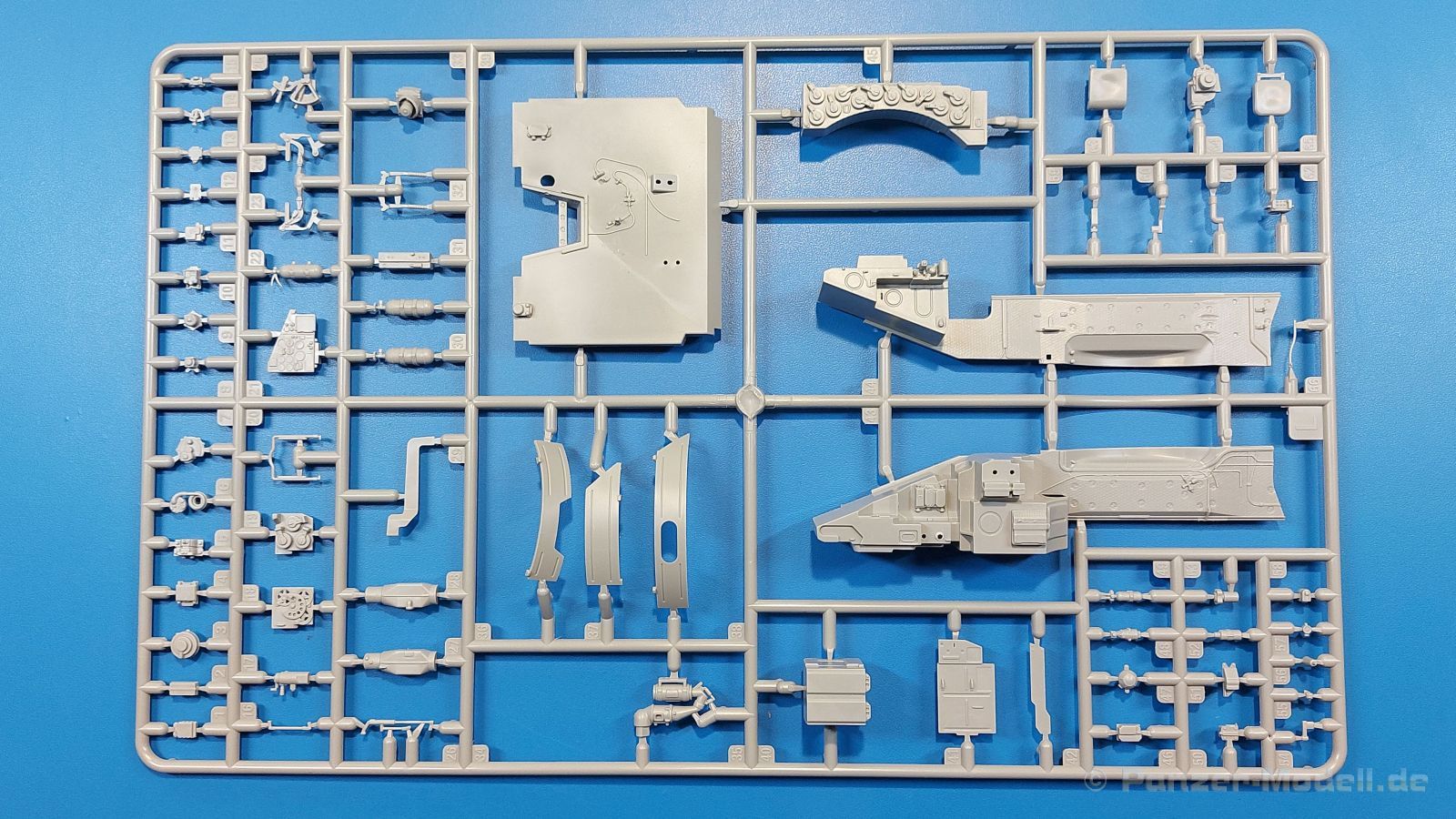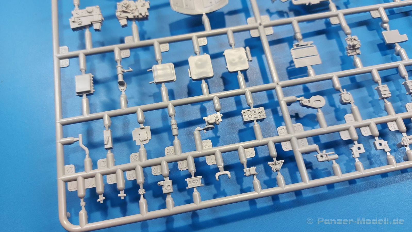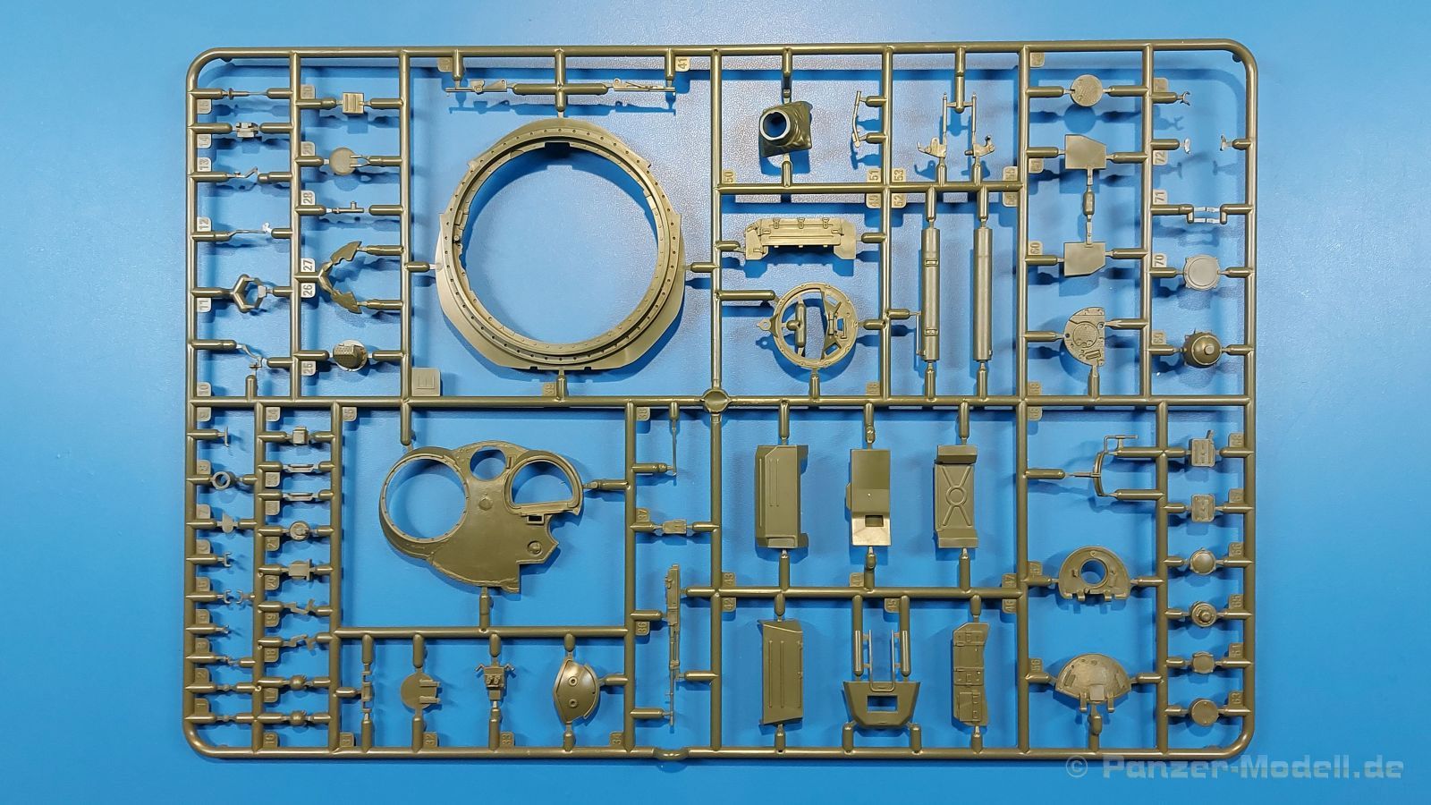 Der Bausatz: Nicht nur im Original gibt es jede Menge T-72. Modellbauer können sich sicherlich nicht über Mangel an entsprechenden Modellen beschweren. Amusing Hobby hat dem ganzen noch einen draufgesetzt und den ersten T-72 mit vollständiger Inneneinrichtung (Fahrer-, Motor- und Kampfraum inkl. Ladekarussel und -mechanismus) auf den Markt gebracht. Auch dieser T-72 AV Bausatz ist voll ausgestattet. Um die ganzen Spritzlinge aufzunehmen, ist der Karton mit 400 x 260 x 120 mm auch etwas größer ausgefallen. Er enthält 54 Spritzlinge (in olivgrün, hellgrau, braun und durchsichtig), die Unterwanne, Turm, 1 Metallfeder, 1 PE-Platine, 1 Kabel, 1 Draht, 1 Abziehbilderbogen und die Bauanleitung. Im Standard der heutigen Zeit ist die Qualität der Teile ausgezeichnet. Scharfe Details, teils kleine und feine Teile, kein Verzug oder Versatz vorhanden. Es gibt zwar Auswerferspuren, aber nur dort, wo sie nach dem Zusammenbau nicht mehr zu sehen sind. Einige hervorstehende Auswerferreste auf manchen Teilen, hier z.B. an den Innenseiten der Kettenschürzen und dem Grabschild, sollten aber entfernt werden, da die Teile sonst nicht korrekt montiert werden können. Das Klarsichtteile für die Scheinwerferscheiben sind schön geriffelt, die Gussstruktur am Turm ist glaubhaft wiedergegeben und wenn man genau hinsieht, sieht man Gussnummern an den Kettengliedern. Die Spritzlinge sind farblich getrennt - Olivgrün für den eigentlichen Panzer, Hellgrau für die Inneneinrichtung und Braun für die Kettenglieder und -bolzen. Schauen wir uns mal die Wanne an. Sie besteht aus einem Teil, das Unterboden und die Seitenteile beinhaltet. Grad der T-72-typische und auffällige Unterboden ist sehr gut dargestellt. Öffnungen für Wartungsdeckel und Notausstiegsluke sind vorhanden. Innen sind zwar mehrere Auswerferspuren zu sehen, aber diese werden wohl komplett von der Inneneinrichtung verdeckt. Die Inneneinrichtung ist ein Modell für sich. Beginnend beim Fahrerraum mit der gesamten Pedalerie, sämtlichen Instrumenten, dem hervorragenden Fahrersitz über die Munitionskästen, Staukästen, Feuerlöscher bis zum unglaublich gut dargestellten Karussell des Autoladers, in dem verschiedene Munitionssorten optional eingesetzt werden können, ist alles vorhanden. Auch im Heck ist der Dieselmotor mit Turboaufladung, sowie der Kühler (der Lüfterpropeller ist ein echter Hingucker!), die Treibstofftanks und das Getriebe vorhanden. Es sind ebenfalls Luftfilter, die Lichtmaschine, wichtige Leitungen und Verstrebungen dargestellt. Auch der Turm ist vollständig eingerichtet. Der Bau des Turmes beginnt mit dem Bau der 125mm Kanone 2A46(D-81). Hier werden zunächst der Verschluss und der Rest der Waffenanlage zusammengesetzt, dann folgen der Richtschützen- und der Kommandantensitz und diverse Anbauteile. Viele Teile der Ladeautomatik wollen auch zusammengesetzt werden. Der Turm besteht aus einer Innen-, einer Außenschale und einem Turmdrehkranz. Zusätzlich wird noch ein Teil des Turmdaches separat eingesetzt. So erreicht man einen ungeheuren Realismus in der Materialdicke. Zudem sind zum Beispiel alle Schutzpolsterungen und Nietungen genauestens dargestellt. Natürlich können alle Luken offen dargestellt werden, und die Maschinengewehre (Koaxial und Flugabwehr) sind mit offenen Rohrmündungen wiedergegeben. Die Optiken des Richtschützen und des Kommandanten, sowie die Funkanlage kann sich wirklich sehen lassen. Beim Fahrwerk werden die Drehstäbe (mit den angegossenen Schwingarmen) in die hervorragend wiedergegeben Unterwanne geklebt, und bleiben beweglich. Dadurch kann das Modell auch an unebene Untergründe angepasst werden, und macht in jedem Diorama eine gute Figur. Auch die Trieb-, Leiträder, Lauf- und Stützrollen sind sehr schön wiedergegeben und setzen sich erfreulicherweise aus nur wenigen Teilen zusammen, ohne hier an der Detaillierung zu sparen. Die Ketten sind als Einzelgliedketten ausgelegt. Schaut man sich die Glieder näher an, entdeckt man in den Riffeln der Außenseite feinste Gussnummern. Jede Seite benötigt fünfundneunzig Kettenglieder. Diese befinden sich an achtundzwanzig Spritzlingen zu je 8 Gliedern, die einzeln abgetrennt und versäubert werden wollen. Die Kette soll voll beweglich bleiben. Dies wird mithilfe der Bolzenlöcher in den Gliedern und separaten Bolzen erreicht. Die Kettenbolzen befinden sich an sieben eigenen Gussästen. Diese können zu Gruppen aus je zwei Bolzen bzw. vier Bolzen ausgeschnitten werden und mit Hilfe einer Montagehilfe, in welche die einzelnen Kettenglieder eingelegt werden, in die Bohrungen der einzelnen Glieder eingesetzt werden. Der Kettenbau wird sicherlich einen gewissen Teil der Arbeit an diesem Bausatz ausmachen. Die Heckplatte hat bereits einen großen Wartungsdeckel mit fünf Schraubenköpfen angegossen. Zwei Ersatzkettenglieder plus deren Halterungen und zwei Bergehaken bringt man beidseitig des Wartungsdeckels an. Der typische Bergebalken fehlt natürlich auch nicht. Er zeigt Trocknungsrisse des Holzes, aber kaum eine Maserung. An den oberen Rand kommen die Halterungen für die Kraftstofffässer. Die typischen Heckfässer sind im Slide-Mould-Verfahren hergestellt, haben bereits die Haltebänder und Leitungsanschlüsse bereits angegossen und werden nur mit den Seitenteilen komplettiert. Die typischen Treibstoffleitungen, welche zum Motor führen, werden mit Hilfe einer Spiralfeder mit eingelegtem Draht simuliert. Die Bugplatte besteht aus drei Platten - Innenplatte mit Elementen der Inneneinrichtung, der eigentlich Panzerplatte und einer Zusatzpanzerplatte. Auf diese Zusatzpanzerplatte werden die Kacheln der Reaktivpanzerung, bestehend aus Einzel- und Gruppenelementen, aufgesetzt. Die Fahrscheinwerfer sind ausgehöhlt und bekommen geriffelte Klarsichtgläser. Die Scheinwerferhalterung sind etwas „komisch“ aufgeteilt. Man klebt die geteilten Gestänge stumpf aufeinander. Die Kettenbleche sind bereits an der Unterwanne angegossen. Es kommen einige Verst