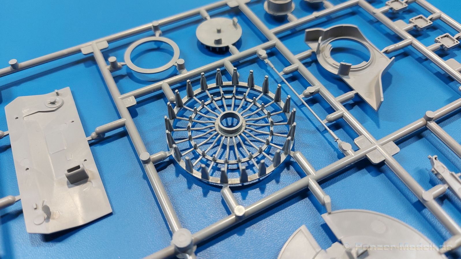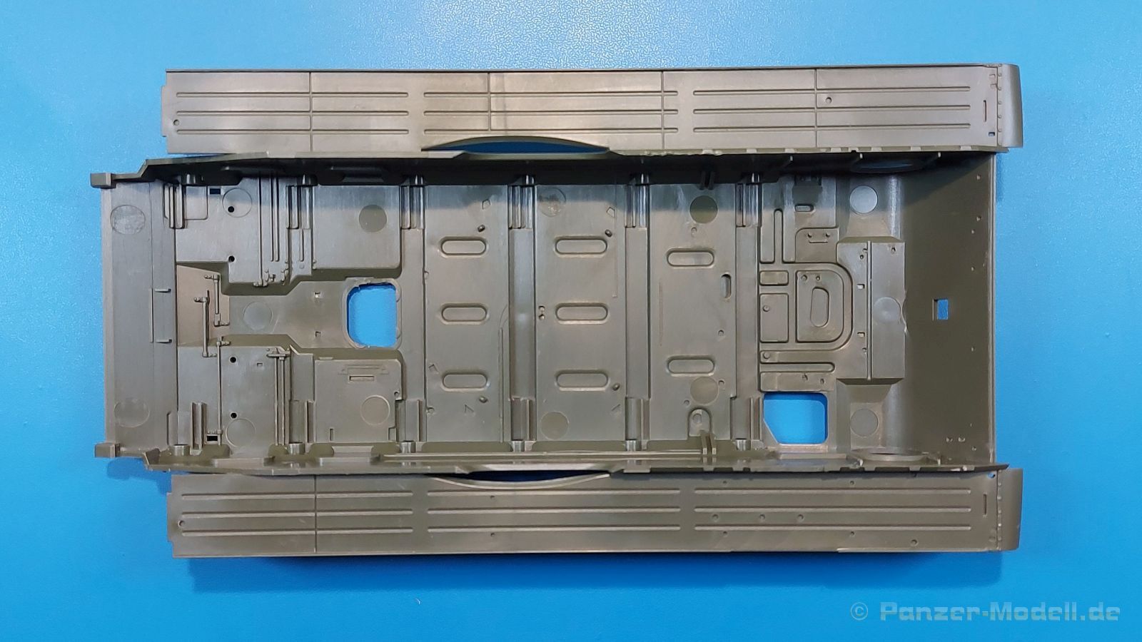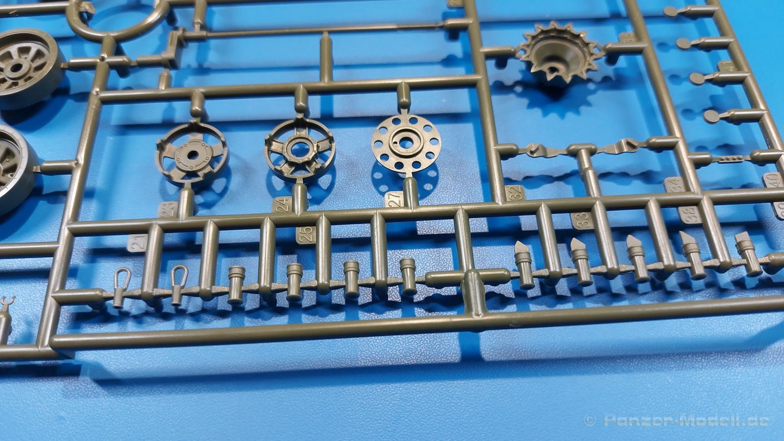 Der Bausatz: Nicht nur im Original gibt es jede Menge T-72. Modellbauer können sich sicherlich nicht über Mangel an entsprechenden Modellen beschweren. Amusing Hobby hat dem ganzen noch einen draufgesetzt und den ersten T-72 mit vollständiger Inneneinrichtung (Fahrer-, Motor- und Kampfraum inkl. Ladekarussel und -mechanismus) auf den Markt gebracht. Auch dieser T-72 AV Bausatz ist voll ausgestattet. Um die ganzen Spritzlinge aufzunehmen, ist der Karton mit 400 x 260 x 120 mm auch etwas größer ausgefallen. Er enthält 54 Spritzlinge (in olivgrün, hellgrau, braun und durchsichtig), die Unterwanne, Turm, 1 Metallfeder, 1 PE-Platine, 1 Kabel, 1 Draht, 1 Abziehbilderbogen und die Bauanleitung. Im Standard der heutigen Zeit ist die Qualität der Teile ausgezeichnet. Scharfe Details, teils kleine und feine Teile, kein Verzug oder Versatz vorhanden. Es gibt zwar Auswerferspuren, aber nur dort, wo sie nach dem Zusammenbau nicht mehr zu sehen sind. Einige hervorstehende Auswerferreste auf manchen Teilen, hier z.B. an den Innenseiten der Kettenschürzen und dem Grabschild, sollten aber entfernt werden, da die Teile sonst nicht korrekt montiert werden können. Das Klarsichtteile für die Scheinwerferscheiben sind schön geriffelt, die Gussstruktur am Turm ist glaubhaft wiedergegeben und wenn man genau hinsieht, sieht man Gussnummern an den Kettengliedern. Die Spritzlinge sind farblich getrennt - Olivgrün für den eigentlichen Panzer, Hellgrau für die Inneneinrichtung und Braun für die Kettenglieder und -bolzen. Schauen wir uns mal die Wanne an. Sie besteht aus einem Teil, das Unterboden und die Seitenteile beinhaltet. Grad der T-72-typische und auffällige Unterboden ist sehr gut dargestellt. Öffnungen für Wartungsdeckel und Notausstiegsluke sind vorhanden. Innen sind zwar mehrere Auswerferspuren zu sehen, aber diese werden wohl komplett von der Inneneinrichtung verdeckt. Die Inneneinrichtung ist ein Modell für sich. Beginnend beim Fahrerraum mit der gesamten Pedalerie, sämtlichen Instrumenten, dem hervorragenden Fahrersitz über die Munitionskästen, Staukästen, Feuerlöscher bis zum unglaublich gut dargestellten Karussell des Autoladers, in dem verschiedene Munitionssorten optional eingesetzt werden können, ist alles vorhanden. Auch im Heck ist der Dieselmotor mit Turboaufladung, sowie der Kühler (der Lüfterpropeller ist ein echter Hingucker!), die Treibstofftanks und das Getriebe vorhanden. Es sind ebenfalls Luftfilter, die Lichtmaschine, wichtige Leitungen und Verstrebungen dargestellt. Auch der Turm ist vollständig eingerichtet. Der Bau des Turmes beginnt mit dem Bau der 125mm Kanone 2A46(D-81). Hier werden zunächst der Verschluss und der Rest der Waffenanlage zusammengesetzt, dann folgen der Richtschützen- und der Kommandantensitz und diverse Anbauteile. Viele Teile der Ladeautomatik wollen auch zusammengesetzt werden. Der Turm besteht aus einer Innen-, einer Außenschale und einem Turmdrehkranz. Zusätzlich wird noch ein Teil des Turmdaches separat eingesetzt. So erreicht man einen ungeheuren Realismus in der Materialdicke. Zudem sind zum Beispiel alle Schutzpolsterungen und Nietungen genauestens dargestellt. Natürlich können alle Luken offen dargestellt werden, und die Maschinengewehre (Koaxial und Flugabwehr) sind mit offenen Rohrmündungen wiedergegeben. Die Optiken des Richtschützen und des Kommandanten, sowie die Funkanlage kann sich wirklich sehen lassen. Beim Fahrwerk werden die Drehstäbe (mit den angegossenen Schwingarmen) in die hervorragend wiedergegeben Unterwanne geklebt, und bleiben beweglich. Dadurch kann das Modell auch an unebene Untergründe angepasst werden, und macht in jedem Diorama eine gute Figur. Auch die Trieb-, Leiträder, Lauf- und Stützrollen sind sehr schön wiedergegeben und setzen sich erfreulicherweise aus nur wenigen Teilen zusammen, ohne hier an der Detaillierung zu sparen. Die Ketten sind als Einzelgliedketten ausgelegt. Schaut man sich die Glieder näher an, entdeckt man in den Riffeln der Außenseite feinste Gussnummern. Jede Seite benötigt fünfundneunzig Kettenglieder. Diese befinden sich an achtundzwanzig Spritzlingen zu je 8 Gliedern, die einzeln abgetrennt und versäubert werden wollen. Die Kette soll voll beweglich bleiben. Dies wird mithilfe der Bolzenlöcher in den Gliedern und separaten Bolzen erreicht. Die Kettenbolzen befinden sich an sieben eigenen Gussästen. Diese können zu Gruppen aus je zwei Bolzen bzw. vier Bolzen ausgeschnitten werden und mit Hilfe einer Montagehilfe, in welche die einzelnen Kettenglieder eingelegt werden, in die Bohrungen der einzelnen Glieder eingesetzt werden. Der Kettenbau wird sicherlich einen gewissen Teil der Arbeit an diesem Bausatz ausmachen. Die Heckplatte hat bereits einen großen Wartungsdeckel mit fünf Schraubenköpfen angegossen. Zwei Ersatzkettenglieder plus deren Halterungen und zwei Bergehaken bringt man beidseitig des Wartungsdeckels an. Der typische Bergebalken fehlt natürlich auch nicht. Er zeigt Trocknungsrisse des Holzes, aber kaum eine Maserung. An den oberen Rand kommen die Halterungen für die Kraftstofffässer. Die typischen Heckfässer sind im Slide-Mould-Verfahren hergestellt, haben bereits die Haltebänder und Leitungsanschlüsse bereits angegossen und werden nur mit den Seitenteilen komplettiert. Die typischen Treibstoffleitungen, welche zum Motor führen, werden mit Hilfe einer Spiralfeder mit eingelegtem Draht simuliert. Die Bugplatte besteht aus drei Platten - Innenplatte mit Elementen der Inneneinrichtung, der eigentlich Panzerplatte und einer Zusatzpanzerplatte. Auf diese Zusatzpanzerplatte werden die Kacheln der Reaktivpanzerung, bestehend aus Einzel- und Gruppenelementen, aufgesetzt. Die Fahrscheinwerfer sind ausgehöhlt und bekommen geriffelte Klarsichtgläser. Die Scheinwerferhalterung sind etwas „komisch“ aufgeteilt. Man klebt die geteilten Gestänge stumpf aufeinander. Die Kettenbleche sind bereits an der Unterwanne angegossen. Es kommen einige Verst