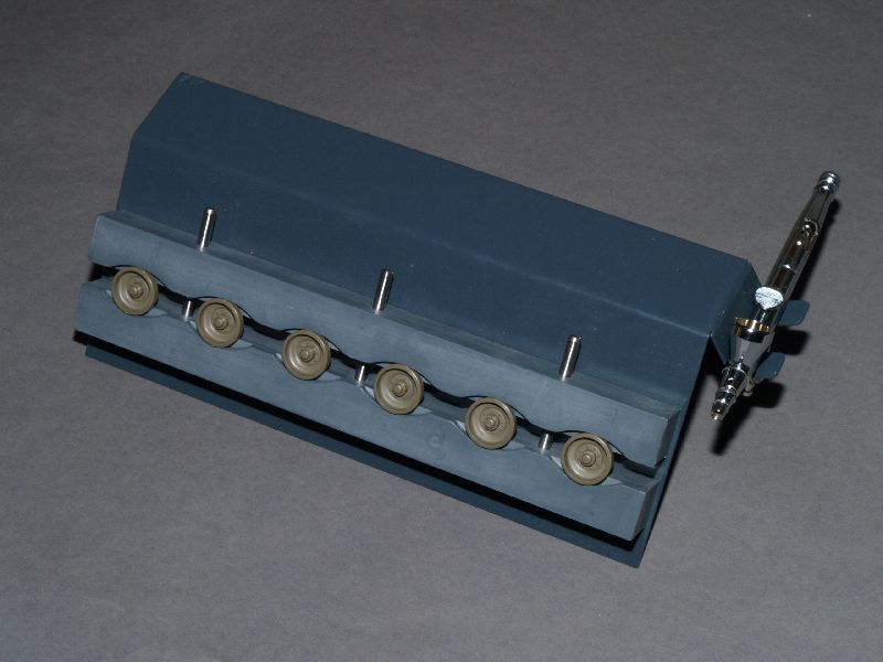 Diese Vorrichtung ist solide verarbeitet. Sie besteht aus einem Grundteil aus beschichteten Metall und einem dort montierten Kunstoffblock. In diesen werden bis zu sechs Laufrollen eingelegt, die durch das passende Kunstoffgegenstück festgehalten werden. Dieses Trum hat eine Breite von fast 30 cm und ist mit gut einem Kilo Gewicht auch kein Leichtgewicht. Somit ist ein sicherer Stand und sauberes Arbeiten gewährleistet. Die einzelnen Komponenten machen auf mich einen sehr hochwertigen Eindruck. Als 'Schmankerl' ist an der rechten Seite noch eine Ablage für die Airbrush angebracht, so daß man diese bequem ablegen kann, um z.B. die Laufrollen zu wechseln. Mit Hilfe dieses Werkzeuges können bis zu sechs Laufrollen recht einfach lackiert werden.