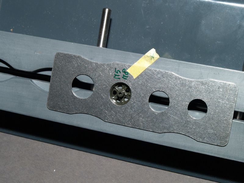 Zur Testzwecken habe ich Laufrollen von einem M8 HMC, einem Leopard 2 und einem T-55 (alle Tamiya) in die Vorrichtung eingespannt, um ein möglicht breites Spektrum der Laufrollendurchmesser abzudecken. Bei jedem Test war die Passgenauigkeit sehr gut. Das auf den Photos sichtbare Masking Tape diente bei den Tests nur zur Fixierung beim Photographieren. Darüber hinaus war es bei den Tests sinnvoll, bei den entsprechenden Durchmesser den Typ auf der Rückseite der Schablone mit einem Edding zu vermerken.