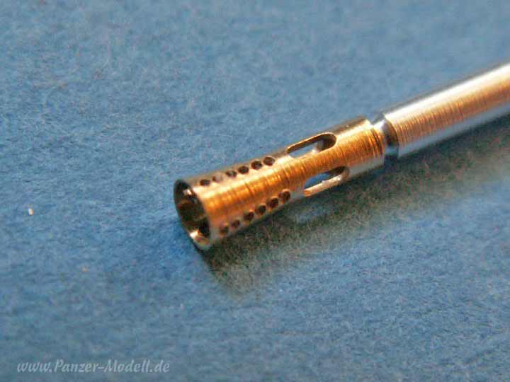 Das Rohr entspricht im goßen und ganzen dem FlaK Rohr, ausser dass es eben kürzer und eine etwas andere Form hat - die Qualität ist aber ebenso hervorragend. Dazu gibt es auch den Mündungsfeuerdämpfer in der konischen Form mit vier Reihen an feinen Lüfzungslöchern und den vier kleinen Schlitzen - unheimlich detailiert. Natürlich liegt auch hier noch ein PE Teil bei, für ein winziges Detail auf der Oberseite des Rohres, das beim Drehen des Rohres nicht dargestellt werden kann und so nachgearbeitet wird.