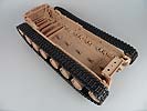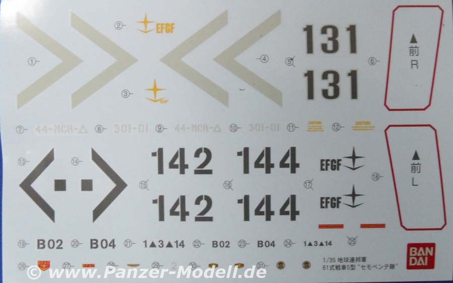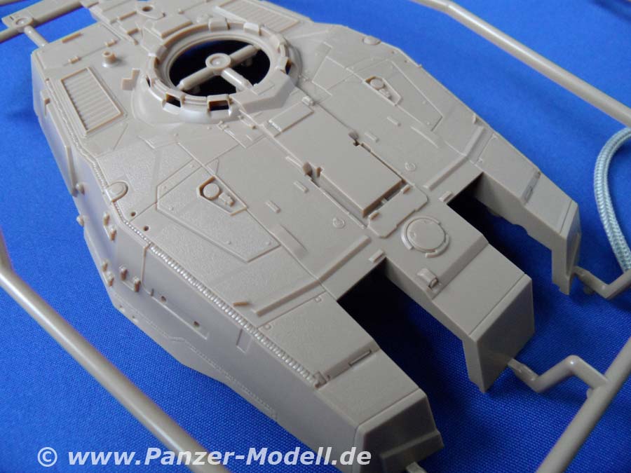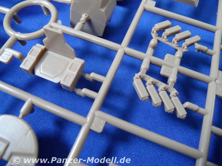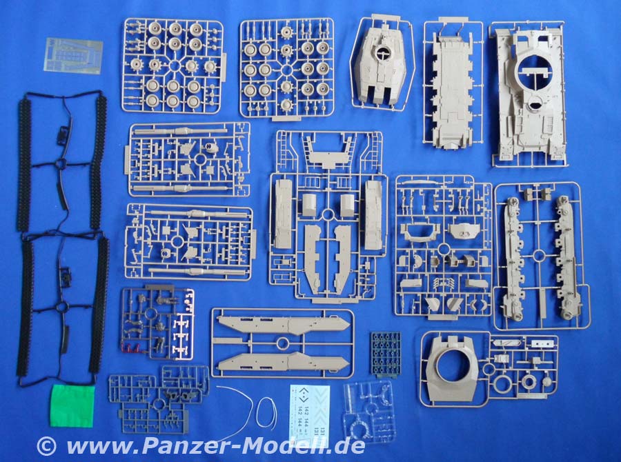Es handelt sich um den Bandai Bausatz 157471 namens E.F.G.F. M61A5 MBT „Semovente“ Phantom Element. Der Bausatz besteht aus 18 Spritzlingen, davon zwei aus Vinyl, einer aus Klarplastik und einer für die Figuren, die in unterschiedlichen Farben gegossen sind. Dazu kommt ein Ätzteilbogen, Decals, Metallstifte und Schnur. Wenn man sich nun die Bauanleitung zur Hand nimmt, stößt man zuerst auf sehr liebevoll gemachte Zeichnungen des Panzers und diverser Ausrüstungsgegenstände. Überhaupt sind in der Anleitung haufenweise solche Zeichnungen zu finden. Klappt man die Seite dann auf gibt es exelente Farbfotos eines gebauten Modells und der Besatzung. Wie gewohnt beginnt die Anleitung mit der Wanne. Diese ist super detailiert und wie auch alle anderen Teile perfekt gegossen. Die großen Hecktüren lassen sich theoretisch offen darstellen. Nachdem man dann die riesigen Laufrollen angebracht hat folgt die Kette. Diese besteht aus je zwei Vinylkettenhälften, die mittels Metallstiften verbunden werden und nicht wie so oft per heißem Schraubenzieher verschweißt. Genial einfach und hält garantiert ewig! Folgt die Oberwanne mit perfekten Details, zu öffnender Fahrerluke und zwei Luken am Heck. (Der Motor sitzt übrigens Vorne. Nicht nur deshalt erinnert dies Monster an einen Merkava. ) Der Fahrer bekommt einen speziellen „Sitz“, durch den die Vollfigur des Fahrers in der richtigen Höhe gehalten wird. Warum ich das so betone ist das der Fahrer, obwohl nur der Kopf rausguckt, als Vollfigur enthalten ist und somit auch neben dem Fahrzeug plaziert werden kann. Die dicken Kästen auf dem vorderen Teil der Kettenbleche können ebenso wie die Seitenschürzen optional angebaut werden. Kommen wir also langsam zum Turm! Bevor Ober- und Unterteil verbunden werden kommt noch der Boden der Staukörbe (geniale Konstruktion, die Ausrichten der Streben überflüssig macht), die Rohrwiege und die Klarteile für die Winkelspiegel rein. Außerdem gibt es noch den Sitz des Kommandanten. Sonst bleibt der Innenraum allerdings leer. Die beiden Kanonen werden durch ein strammes System sicher in Position gehalten. Fehlen noch die Seitenteile des riesigen (was ist bei dem Teil nicht riesig???) Staukorbes, welche mit den beiliegenden Ätzteilen vergittert werden. Noch die restlichen Kleinteile ran und schon steht der Hochzeit von Wanne und Turm nichts mehr im Wege. Fehlt noch die tolle Besatzung und die MGs, sowie die Rohrverzurrung, welche wahlweise das Rohr fest hält oder zusammengeklappt gebaut wird. Als Bemalungsvariation wird ein Panzer gezeigt, der einem Israeli doch stark ähnelt. Insgesamt sehr Merkava-like, dies Monster. Allerdings ist, und das ist ja das schöne an solchen Zukunftsbausätzen, die Bemalung reine Fantasiesache. Und wenn er rosa mit gelben Punkten wird. Fazit: Wenn man immer nur das alte Zeug baut ist das evtl. auch irgendwann langweilig und der Schweinepanzer vielleicht nicht jedermanns Sache. Hier kann man sich dann mal entspannt mit einem Schüttelbausatz kreativ austoben und bleibt dem 35er Maßstab trotzdem noch treu. Zudem ist es ein echter Hingucker. Schlägt er doch in seinen Abmessungen locker die Maus und den E-100. Leider ist der Bausatz nicht billig. 110-120 EUR sind schon viel Geld. Und dann gibt’s ja noch das ganze Zeug drumrum. Soldaten, Jeeps, Truppentransporter und sogar die riesigen Roboter (in 1:48, aber passt schon!). Also! Kaufen, wenn man mal was Anderes und Besonderes will!