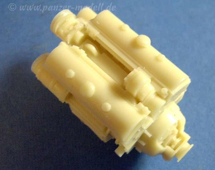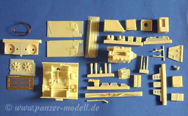 Der Bausatz besteht aus der übersichtliche Zahl von knapp 40 Resinteilen, sowie zwei sehr feinen, geätzten Motorluftgitter, Die Bauteile sind hervorragend im Guss und sehr fein un dliebevoll im Detail. Schon allein der Motorraum an sich mit innenliegenden Drehstäben ist eine Augenweide, die sich weiter über den Motor an sich, den sehr feinen Lüfterrädern, Kühler, Batterie, Zuleitungen, Tanks, Luftfilter, usw., usw. erstreckt.