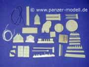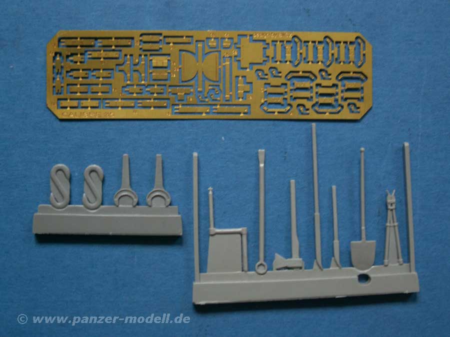 Ein interessantes Set, das in hervorragender Gussqualität Resinteile bietet. Hierbei enthalten: S-Haken, Schlüssl, Anlasserkurbel, Brechstangen, Axt, Schaufel und Drahtschneider. Als Ergänzung dazu ein recht großes Set an PE Teilen zur Verfeinerung der Werkzeuge mit fein detailierten Halterungen aus mehreren Teilen. Macht einen super Eindruck.