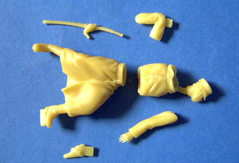 Die Teile sind allesamt dehr fein und detailiert gegossen, ohne jegliche Luftblasen. Auch Angüsse sind angenehm wenig zu finden. Der Faltenwurf des Mantels finde ich besonders gut gelungen wie auch den hochstehenden Kragen. Auch der Kopf mit der Mütze ist gut gemacht.