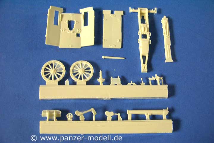 Die Teile dieses Bausatzes sind aus Resin, fein gegossen, ohne jeglichen Verzug oder Luftbläschen. Nicht mal 20 Teile erfreuen hier den Modellbauer mit feinen Details wie z.B. den schönen Speichenrädern. Auch das Resinrohr ist durchaus als gut zu bezeichnen. Die angenehm wenigen Teile lassen sich sicher an einem Tag zusammenbauen und auch von Anfängern beherrschen, denn zum einen sind die Angüsse recht gut gewählt und dürften lediglich bei den Rädern etwas mehr Arbeit machen, zum anderen ist die Bauanletung auf einem DIN A4 Zettel sehr gut und verständlich dargestellt und bietet zudem noch Informationen über das Original!