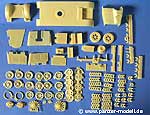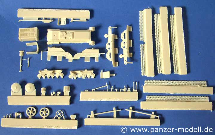 Die knapp 40 Resinteile erfreuen den Modellbauer wieder mit der bekannten Detailqualität, sowie sauberem Guss und akzeptablen Angüssen. Lediglich die Resinkettenstücke bedürfen etwas Nacharbeit und sind erfahrungsgemäß arbeitsintensiver beim herumbiegen um die Treib und Leiträder.