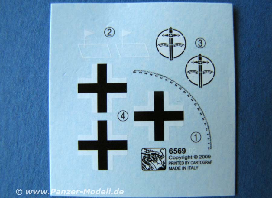 Der Decalbogen ist recht spartanisch mit 3 Balkenkreuzen, dem Einheitenabzeichen der schw-Pz.Jg.Abt.653, den taktischen Zeichen und der Höhenrichtskala der Flak versehen. In dem angegebenen Bemalungsvorschlag von Dragon ist die Unterwanne in grün, der Rest in Dreifarb Streifentarnung ohne Markierungen.