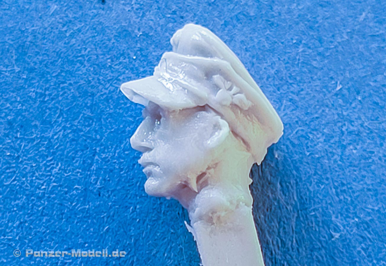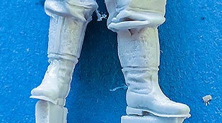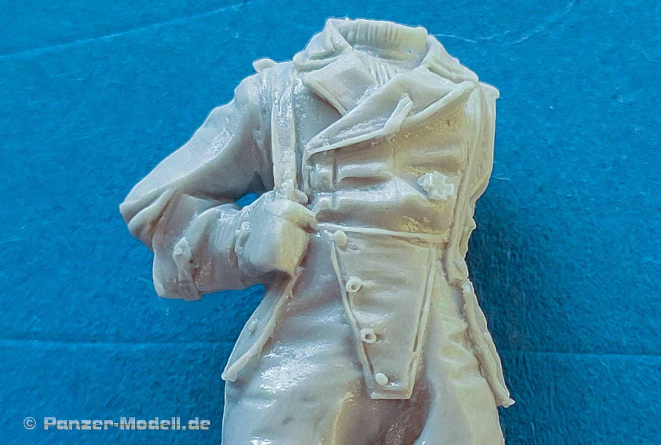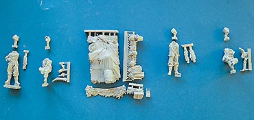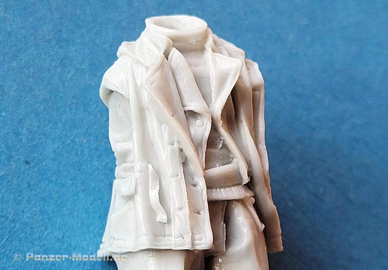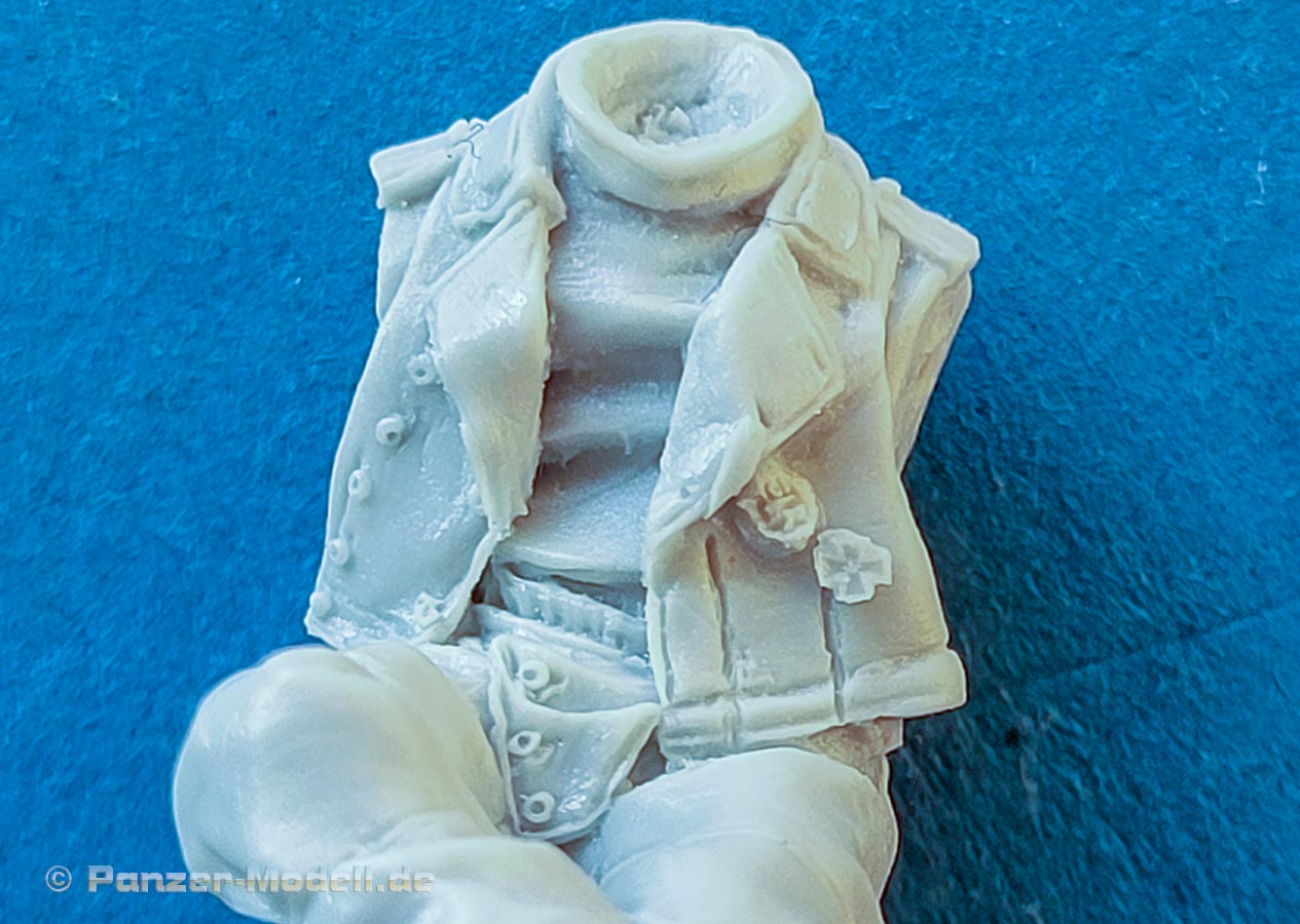 Die Figuren bestehn aus nur wenigen Teilen - die Körper sind in der Regel in einem Stück komplett gegossen und müssen nur noch durch Kopf und Arme ergänzt werden. Dabei ist der Guss wie gesagt sehr gut und sehr fein detailliert, wobei bei Nahansicht fallen feine Resinfussel an den Gusskanten auf, die man ggf mit einem Schleifvlies schnell entfernen kann.