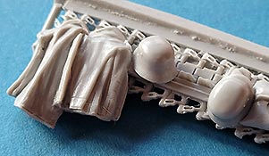 Als Ergänzung dieser Szenerie gibt es das Packset für den Jagdpanzer, das auf dem Motordeck angebracht werden kann. Dieses besteht aus 5 Resinteilen - Der Guss ist hier sensationell und unheimlich detailliert. Vor allem gefällt die Abwechslung und realistisch Darstellung mit den verschiedenen Ausrüstungsgegenständen, teilweise mit Plane abgedeckt, dazu Kettenglieder, ein Holzfass, Helme, Eimer, Kanister, etc. Dazu ein großes Gussteil, das Tarnnetze und Abschleppseil.