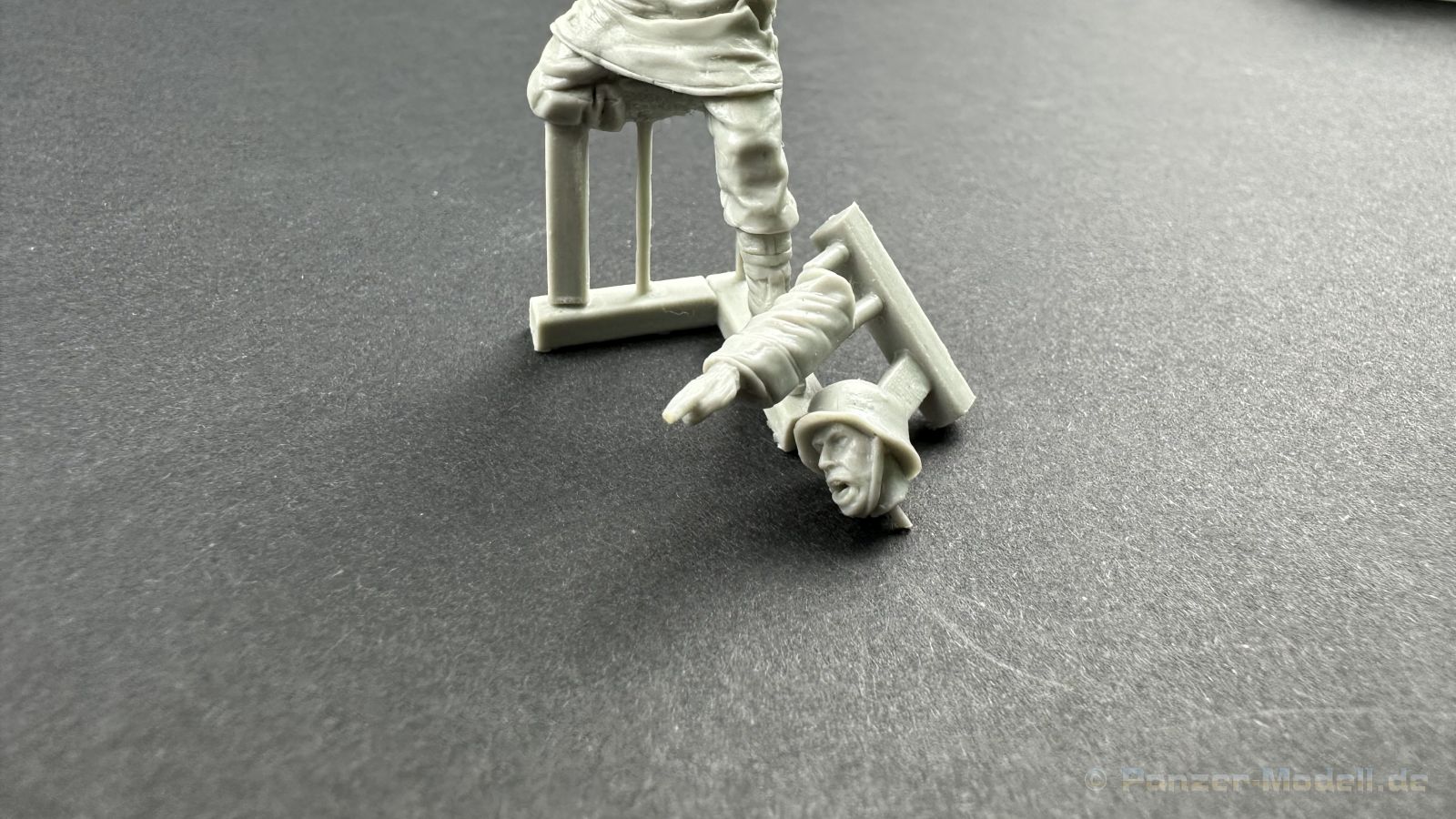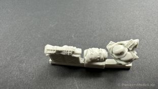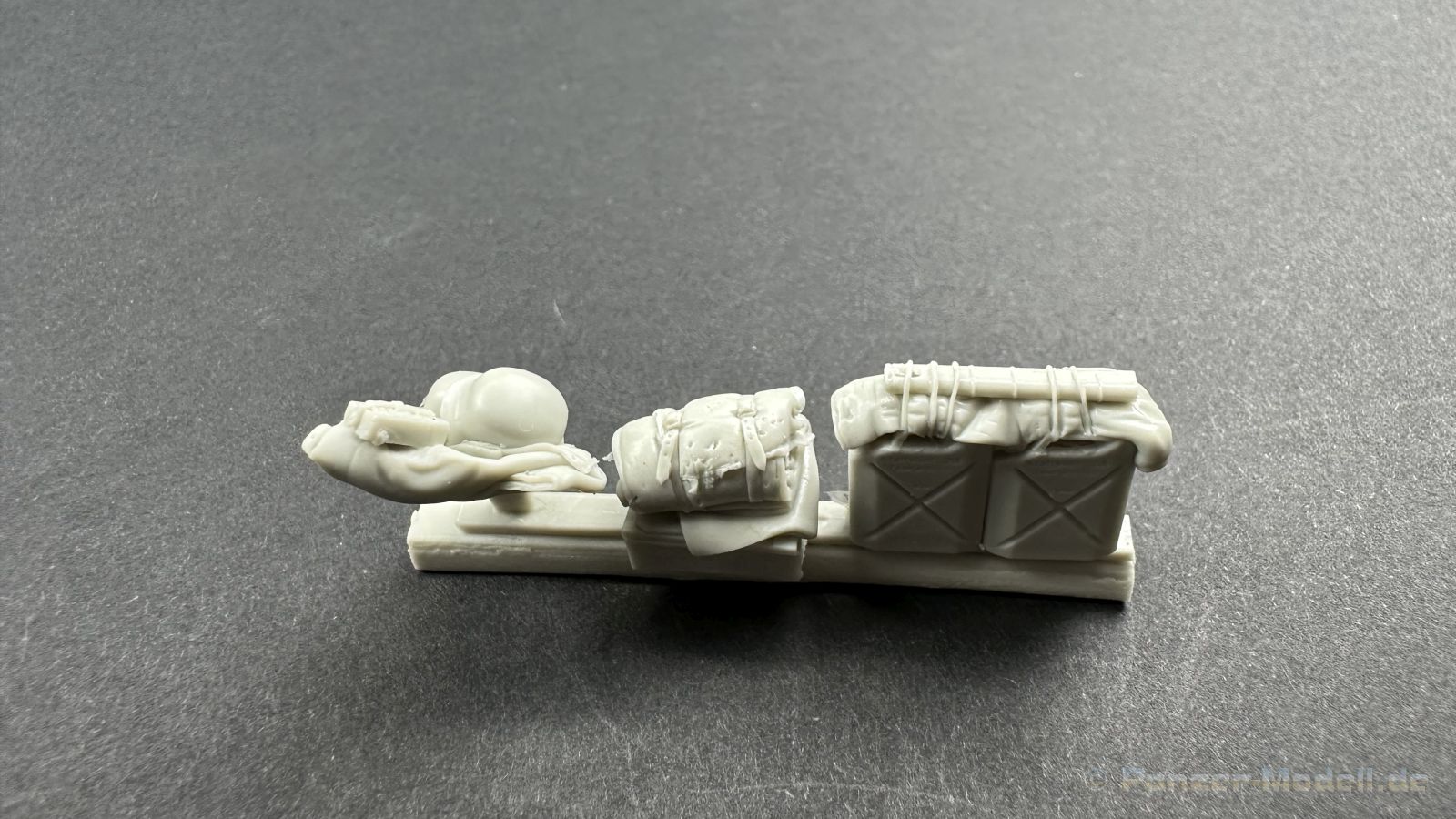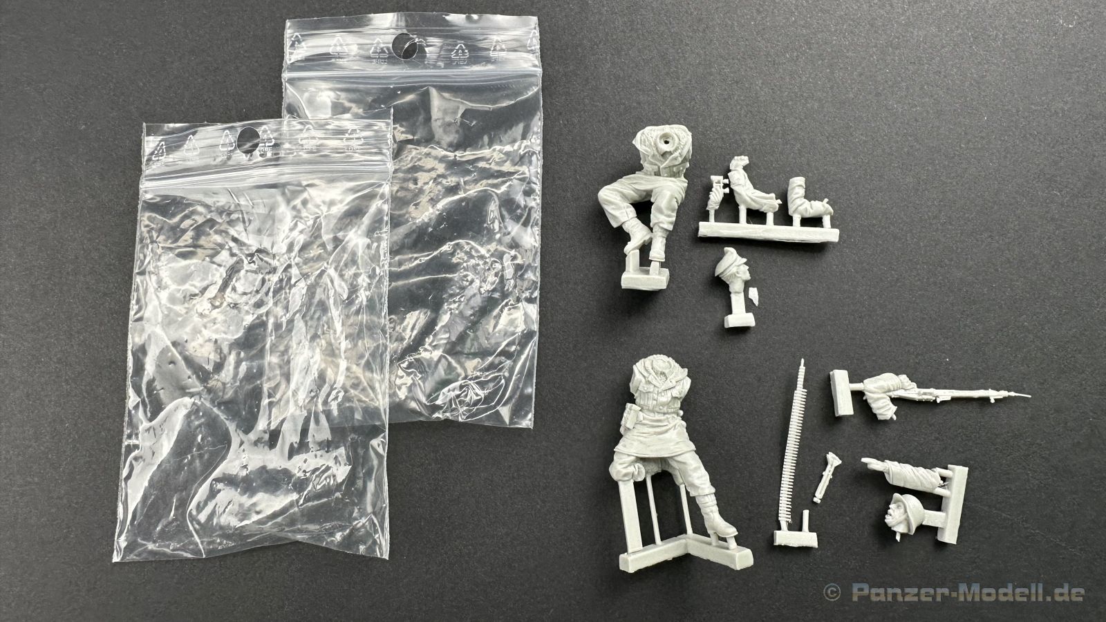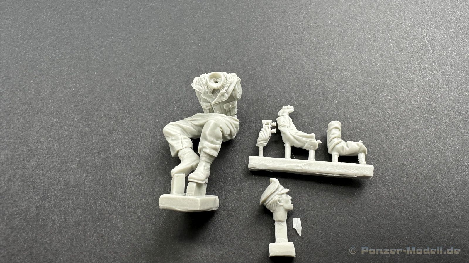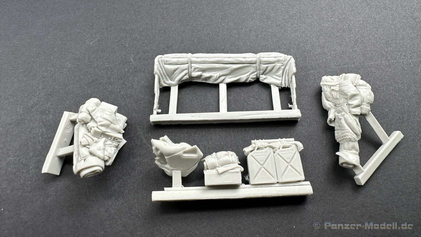 Leider war es um den Hersteller zuletzt sehr ruhig bestellt, umso schöner das wir euch hier dieses Set präsentieren können. Erstmal zu den nackigen Fakten, in dem Set befinden sich 4 Figuren und einiges an Zubehör, passend für den Steyr 1500 von Tamiya. Die Verpackung ist so gestaltet das die Figuren und das Zubehör die es auch einzeln zu Kaufen gibt, hier mit einem großen Aufkleber versehen worden ist um die einzelnen Sets zu einem Megapack zu verbinden sehr Clever ! Ein wenig schade, dass gerade jetzt Tamiya diesen Bausatz vom Markt genommen hat, da nicht nur Darius sondern auch andere Hersteller passendes Zubehör auf den Markt gebracht haben. Zurück zu den Figuren. Die Figuren sind schön sauber und ohne sichtbare Lufteinschlüsse aus Resin hergestellt, zu beachten sind die wirklich großartigen Details, die im Spritzguss so nicht möglich sind. Wir haben hier 4 Figuren in Winteruniform die erstmals im Winter 1942/43 an die Truppen den Waffen-SS herausgegeben worden sind, ein gutes Beispiel ist dafür die 3. Schlacht um Charkow. Interessant ist das der Hersteller als passenden Zeitraum Charkow und Budapest 1945 angibt, ich habe ein wenig nachgeforscht und es stimmt tatsächlich, die Winteruniformen sind zum Frühjahr eingesammelt worden und wurden dann gereinigt und geflickt wieder an die Truppe ausgeliefert. Diese Art der Winterkleidung ist nur bei der Waffen-SS verteilt worden, die Wehrmacht hatte Wendjacken die eine Tarnseite hatten und die andere Seite war in Weiß gehalten, auch der viel gesehene und hier gezeigte Fellbesatz in der Kapuze war der SS vorbehalten. Aber ich schweife ab , die Uniformen sind handwerklich und historisch gut gemacht, auch die Köpfe und die Posen können überzeugen. Kommen wir zum Zubehör, hier haben wir eine Plane, dies wesentlich besser als die von Tamiya ist und einiges an Beladung wie z.B. Kanister, Planen usw. Dem geneigten Modellbauer wird hier für rund 70 Euro ein Figurenset an die Hand gegeben das sehr dynamische Posen bereithält die auf Action schließen lassen und als Bonbon sozusagen das passende Zubehör für den Steyr mit liefert. Muster bereitgestellt durch: