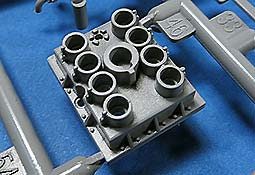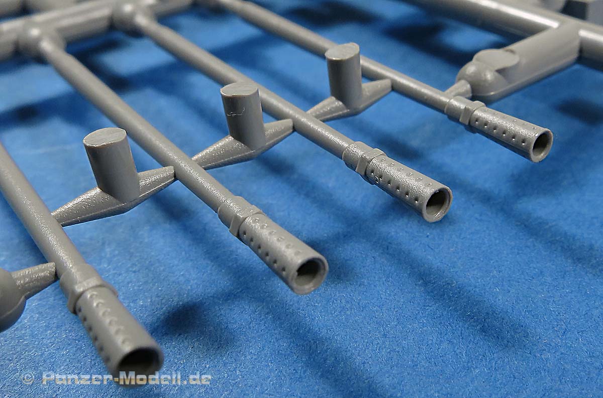 Das augenfälligste Merkmal sind sicher die 8 Flakrohre. Diese sind einteilig aus Plastik mit dem Mündungsfeuerdämpfer gespritzt. Die Detaillierung ist für Plastikrohre recht schln und gefällig mit offener Mündung und angedeuteten Schlitzen und Löchern. Gegen Metallrohre können diese natürlich nicht anstinken, aber diese Ausführung ist so in Metall nicht verfügbar.