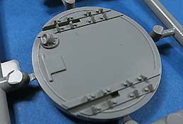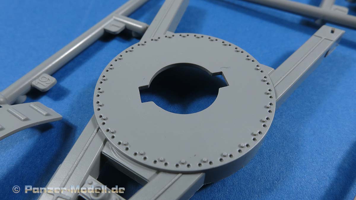 Die Waffenplattform setzt sich aus dem dreieckigen Hauptteil, der die runde Waffenaufnahme beinhaltet, und dem langen Querbalken besteht. Die beiden Ausleger dort sind klappbar und in beiden Positionen baubar, bzw. beweglich baubar. Die Details hier mit feinen Nieten und Bolzen sind wirklich fein und sauber dargestellt.