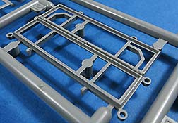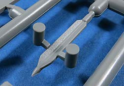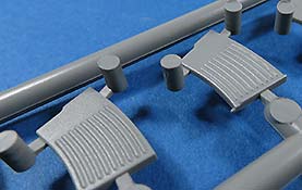 An beiden Seiten hat die Waffenlafette Sitze mit recht dünnwandigem Streben für die Fußstützen. Für den Soldaten rechts ist die Visiereinrichtung und die Richtanlage - die Funktion des Sitzes auf der linken Seite scheint unbekannt zu sein. Wer eine Figur aufsetzen will, muss die Fußstütze ggf. von der Position anpassen. Die Fußrasten sind aus fein geätzten PE Teilen, wie auch eines der zwei wahlweisen Visiere für den Richtschützen.