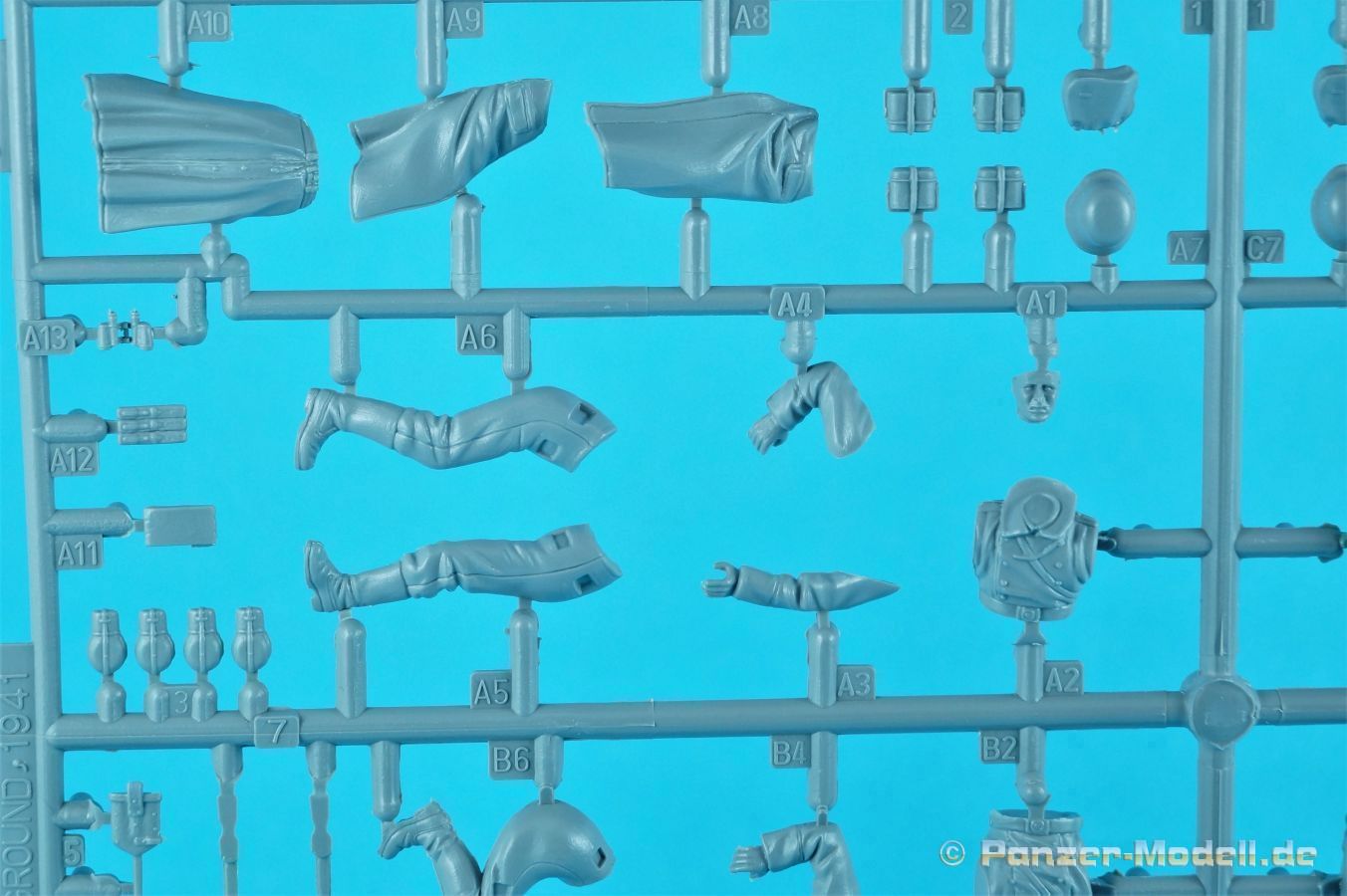 Wenden wir uns zuerst der PaK zu. Die Gußqualität der Teile ist absolut auf der Höhe der Zeit. Alles ist sehr sauber gespritzt und frei von Sinkstellen, Versatz oder Fischhäuten. Auswerferspuren sind so gut wie keine vorhanden und wenn dann in nicht einsehbaren Bereichen. Auch Trennnähte sind so gut wie keine vorhanden. Wenn man auf Ursprung des Kits zurückblickt sollte die Paßgenauigkeit nach wie vor ebenfalls sehr gut sein… Alle Bauteile weisen einen hohen Fertigungsgrad auf. Die Detaillierung ist absolut scharf und überzeugt. Nieten, Bolzen und weitere Details sind sehr gut reproduziert. Das gilt auch für das Schutzschild, das doch recht dünnwandig(!) daherkommt. Sehr schön umgesetzt sind auch die Felgen (Drei Stück zur Auswahl) die mit neuen oder verschlissenen Radreifen bestückt werden. Drei Mündungsbremsen stehen ebenfalls zur Auswahl. Leider gibt es keinen Hinweis in der Bauanleitung wann was verbaut wurde. Recherche ist eventuell angesagt. Auf jeden Fall überzeugen die Bauteile der PaK. Im Rahmen C ist einiges an Zubehör versammelt, das ein Dio zum Leben erwecken kann. Zwei Munitionskisten mit einer dezenten, aber schönen Holzstruktur stehen zur Verfügung die mit den beiliegenden Patronen bestückt werden können. Zwei Typen stehen bei den Patronen zur Auswahl. Auch einige leere Hülsen gibt es. Dazu noch ein paar Gebinde für einzelnen Patronen die man offen oder geschlossen bauen kann. Zubehör das man gerne sieht. Decals für die verschiedenen Beschriftungen sind ebenfalls vorhanden. Was will man mehr!? Und damit kommen wir zu dem Rahmen der die Mannschaft hält. Vier Figuren in Aktion mit der PaK gilt es zu bauen. Diese weisen im Gesamten sehr schöne Posen auf. Punkten können definitiv die ausdrucksstarken Gesichter. An den Armen und Beinen sind jedoch einige Nähte zu egalisieren das aber leicht zu bewerkstelligen ist. Die Ausrüstungsteile gehen ebenfalls in Ordnung, wobei ich mir an manchen Stellen etwas mehr Schärfe gewünscht hätte. Die farbige, acht Seiten umfassende Bauanleitung ist im typischen Das Werk Stil gehalten. Auf dem Deckblatt finden wir Arbeitshinweise, Symbolerklärungen und Farbangaben. Diesmal explizit nur von AMIG. Auf Seite zwei gibt es die obligate Teileübersicht. Neun Baustufen in nicht zu überladener Form führen zum fertigen Modell während die Nr. 10 der Figurengruppe vorbehalten bleibt. Auf den letzten drei Seiten gibt es wieder verschiedene Bemalungsvarianten. Siehe Bildteil. Ein richtig schöner Kit mit vielem “Drumherum”. Und alles zu einem moderaten Preis. Daumen hoch!!!