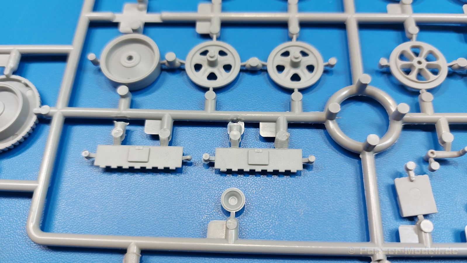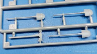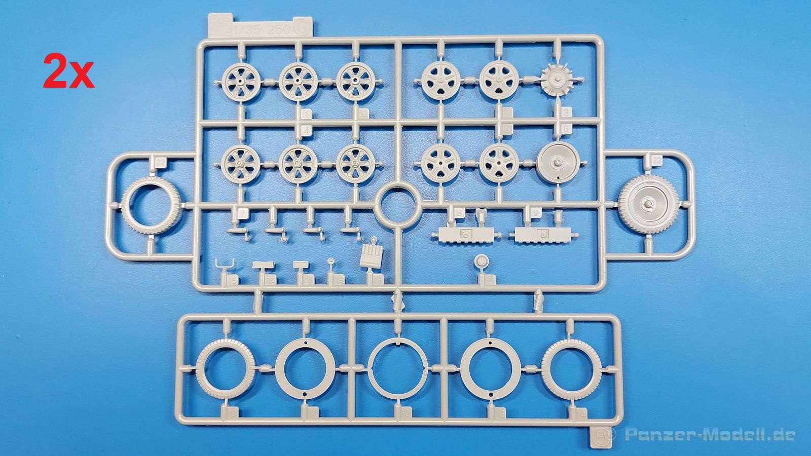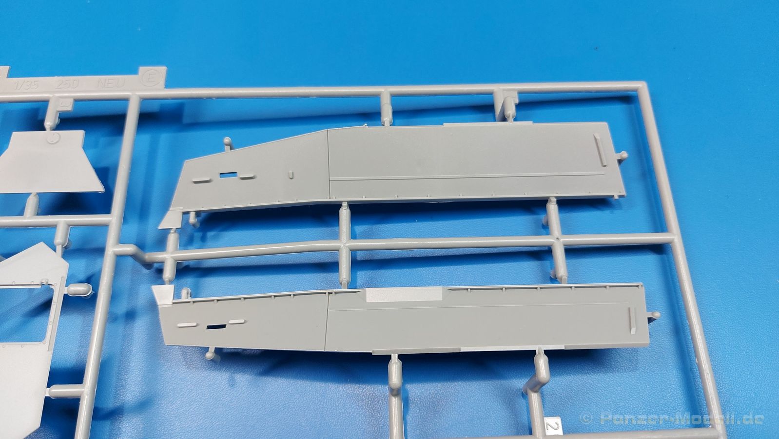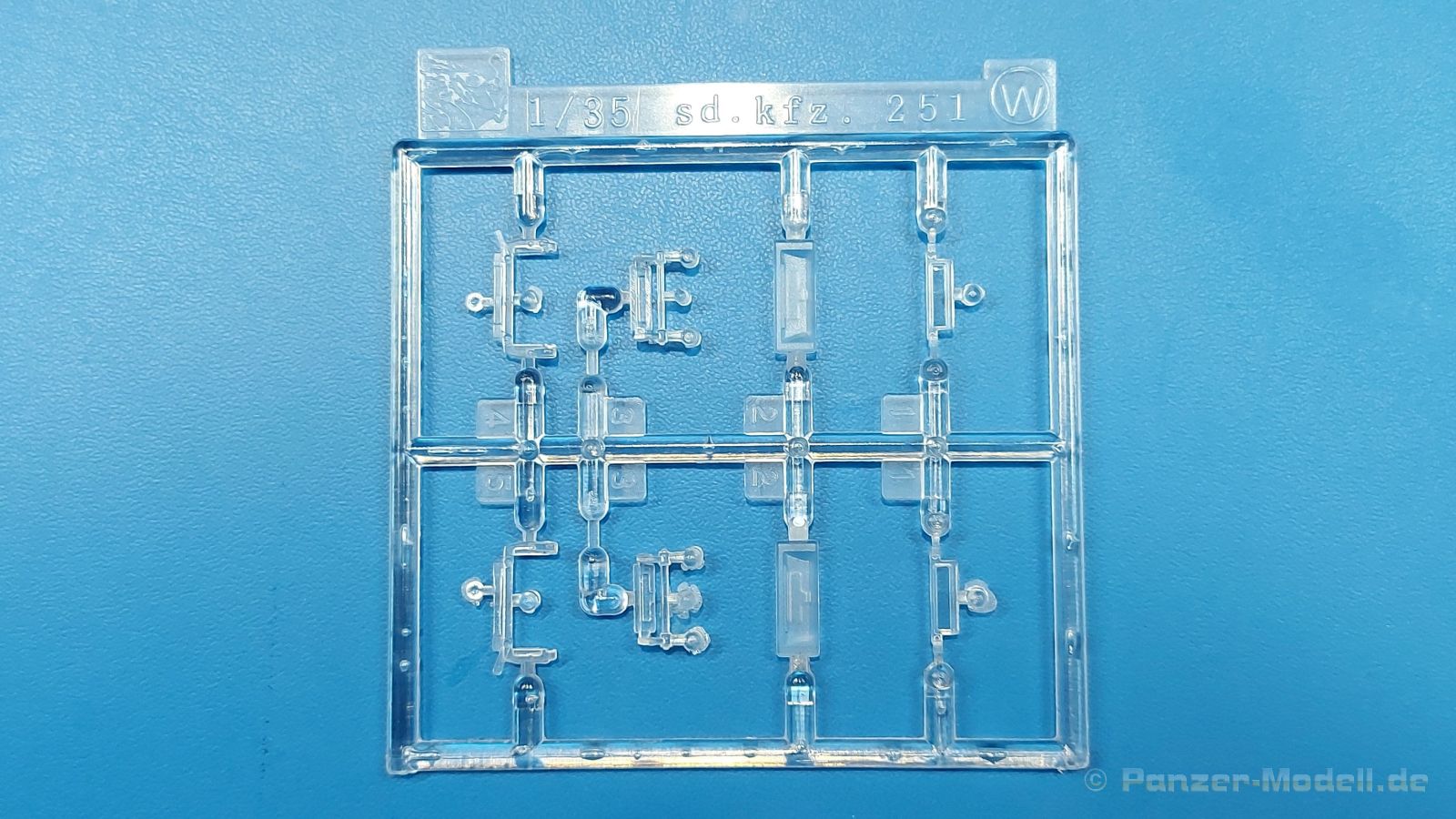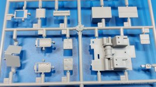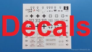 Das Original: Das Sd.Kfz. 250 war ein leichter Schützenpanzerwagen der Deutschen im 2. Weltkrieg, häufig in Panzeraufklärungs- und Kradschützenabteilungen an allen Fronten eingesetzt. Auf das Halbkettenfahrgestell des Sd.Kfz. 10 wurde ein Panzeraufbau aufgesetzt. Bei den älteren Fahrzeugen bestand der sehr verwinkelte Panzeraufbau aus 19 Panzerplatten, bei neueren Fahrzeugen war er gradlinig angeordnet und bestand nur noch aus 9 Panzerplatten. Erste Sd.Kfz. 250 kamen im Sommer 1941 zur Truppe, die neuere Form ab Juni 1943. Mit einem 100 PS Motor konnte der 5 Tonnen schwere Schützenpanzerwagen eine Geschwindigkeit bis zu 65 km/h erreichen. Die Besatzung bestand aus maximal 6 Soldaten. Je nach Einsatzzweck gab es verschiedene Varianten vom Sd.Kfz. 250/1 bis zum Sd.Kfz. 250/12. Das Sd.Kfz. 250/1 war die Schützenpanzer Version mit 6 Mann Besatzung und bis 2 MG Bewaffnung. Seltener in der Aufklärungsrolle eingesetzt, waren Sd.Kfz. 250 öfter zusammen mit Panzern im Gefecht, wobei der Kampf möglichst vom Fahrzeug aus geführt wurde. Der Bausatz: Das Werk belebt den Markt für Sd.Kfz. 250/1-neu Bausätze in Kooperation mit einem asiatischen Hersteller wieder. Der stabile Karton mit Stülpdeckel ist 390 x 255 x 85 mm groß. Darin befinden sich, in Klarsichttütchen verpackt, 10 hellgraue, 1 Klarsichtspritzling, eine Unterwanne, 1 PE-Platine, je ein Tütchen mit Kettengliedern und eines mit Kettenpolstern, 1 Decalblatt und die Bauanleitung. Die Spritzlinge sind einwandfrei, die Teile ohne Versatz oder Sinkstellen. Details sind gut herausgearbeitet. Die Klarsichtteile sind kratzer- und schlierenfrei. Für die Ketten liegt ein Tütchen mit vorgeschnittenen Einzelgliedern und eins mit Kettenpolstern bei, die man ohne weitere Arbeiten zusammenbauen kann. Nur ist etwas feiner Grat ist hier da vorhanden, der noch zu entfernen wäre. Eine Anzahl an PE-Teilen verbessert den bereits guten Detailgrad des Bausatzes. Zwar baut das Sd.Kfz. 250 auf dem Fahrgestell des Sd.Kfz. 10 auf, aber da es sich um ein gepanzertes Fahrzeug handelt, gibt es statt dem Fahrzeugrahmen eine Panzerwanne, die gleich zweimal vorhanden ist. Zum Bau dieses Fahrzeugs braucht man die Wanne Y. Die Wanne aus einem Stück zeigt uns schöne Nietenreihen, Schwingarmlager und Wartungsdeckel am Boden. Antriebsradachsen, Schwingarme, die Spannradachsen und die Kettenspanner werden separat montiert. Bei den Antriebrädern fällt die Wahl auf die je dreiteiligen Räder vom Spritzling H statt den einteiligen des A-Spritzlings. Durch die Dreiteilung kommen die Details besser hervor. Bei genauem Hinsehen erkennt man, dass die Rollenzähne etwas versetzt zu den Auflageflächen der Kettenglieder sind, was vollkommen korrekt ist für eine korrekte Auflage der Kette. Die Lauf- und Spannrollen gefallen mir gut mit ihren dreieckigen Durchbrüchen und hohlgegossenen Speichen. Die Ketten bestehen aus Kettengliedern, die ineinandergesteckt und mit den Kettenpolstern gesichert werden. Bei vorsichtiger Verwendung von Klebstoff bleibt die Kette beweglich. Glieder und Polster befinden sich einzeln in getrennten Klarsichttütchen und können fast ausschließlich ohne Nacharbeit aus der Tüte heraus verwendet werden. Die Vorderachse besteht aus dem querliegenden Blattfederpaket, jedes Federblatt gut erkennbar, der Achse mit den angegossenen Lenkachsen, Lenkgestänge und Stabilisatoren. Da die Lenkachsen angegossen sind, kann ein Lenkeinschlag nicht ohne weiteres bewerkstelligt werden. Die Vorderräder bestehen aus Felge und fünf Radscheiben, die so geformt sind, dass eine entsprechende Profiltiefe entsteht. Auf den äußeren Radscheiben sind in erhabenen Buchstaben/Ziffern Reifenangaben und Hersteller zu sehen. Wahrscheinlich aus Lizenzgründen ist der Herstellername geringfügig verfremdet, aber wenn man das U des letzten Buchstabens zu einem L abändert, kommt man der Wirklichkeit wieder näher. In der Felge ist das Ventilloch vorhanden. Wer mag, kann dort das Ventil aus heißgezogenem Plastik oder Draht für mehr Realismus selbst einsetzen. Es sind auch noch die alten Vorderräder am Spritzling vorhanden. Sie bestehen aus Felgeninnenseiten und dem Reifen mit eingegossener Außenfelge. Hier sind keine Hersteller-/Reifenangaben vorhanden. Der Innenraum hat so einiges zu bieten. Der Fahrerraumboden hat die Antriebsachsabdeckung mit Sitzunterbau bereits angegossen. Fahrer- und Funkersitz bestehen aus Sitzpolster und Rückenlehne. Die Polster sind leicht eingedrückt und wellig dargestellt, sehr glaubhaft. Die Rückenlehnen zeigen nach hin das Drahtgeflecht, auch sehr schön und gut einsehbar durch den oben offenen Kampfraum. Die Motortrennwand bekommt kampfraumseitig eine zweiteilige Kupplungsglocke mit einem Hebel, einen Elektrikkasten, einen Ersatz-Kinonblock (Panzerglas), Lenkstange mit dem Umlenkgetriebe und das Lenkrad selbst. Zwischen den Vordersitzen findet das Getriebe mit zwei Schalthebeln und einem Aufsatzpolster seinen Platz. Auf dem Kampfraumboden wird linksseitig eine Sitzbank, auch mit schönem Polster, montiert. Auf die rechte Seite kommt ein großer Schrank, leider nur mit verschlossenen Türen. Die Innenseiten des Aufbaus werden mit allerlei Ausrüstungsgegenständen ausgestattet – Feuerlöscher, Gasmaskenbüchsen, Kinonblöcken, Handgranatenhalter und Stilhandgranaten, Magazintaschen, Staukasten etc. Hier kommen die meisten Fotoätzteile (PE) zum Einsatz. Der Staukasten und seine Fahrzeughalterung bestehen komplett aus PE. Man kann die Halterung leer im Fahrzeug anbringen und Tragegurte am Kasten anbringen, um ihn dann irgendwo hinzustellen oder einer Figur (nicht enthalten) auf den Rücken zu schnallen. Auch im Aufbauoberteil findet weitere Ausrüstung wie Wasserflaschen, Kasten und Haltegriffe einen Platz. Die seitlichen Sichtblöcke sind aus Plastikmaterial, die vorderen Sichtklappen, die geöffnet oder geschlossen dargestellt werden können, aus Klarsichtmaterial, wobei die äußeren Panzerklappen eine raue Oberfläche haben, um 